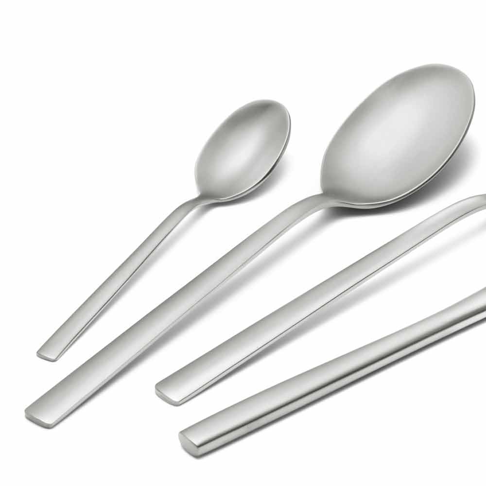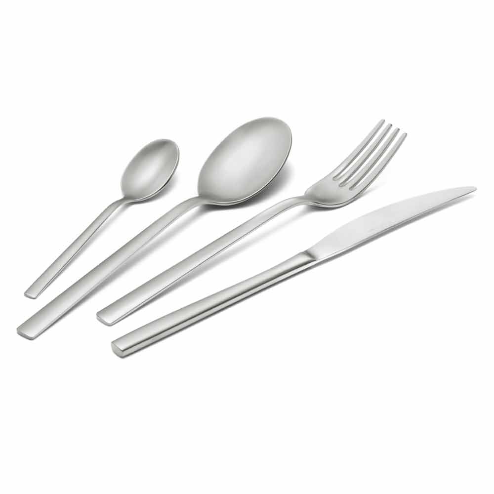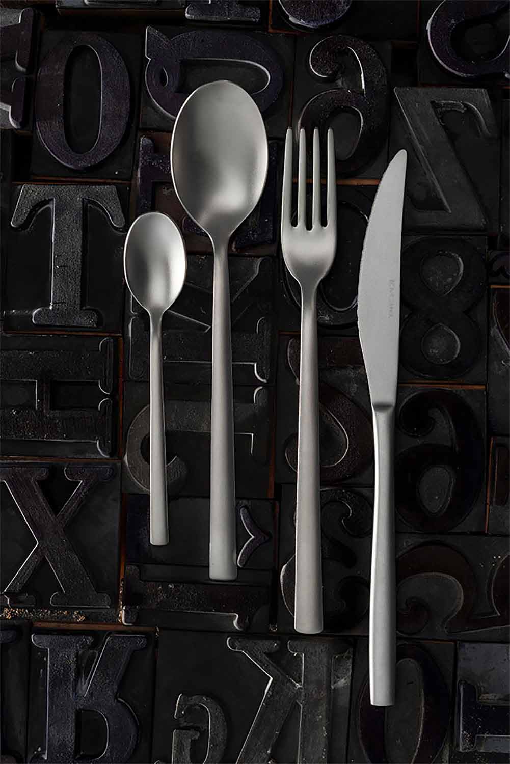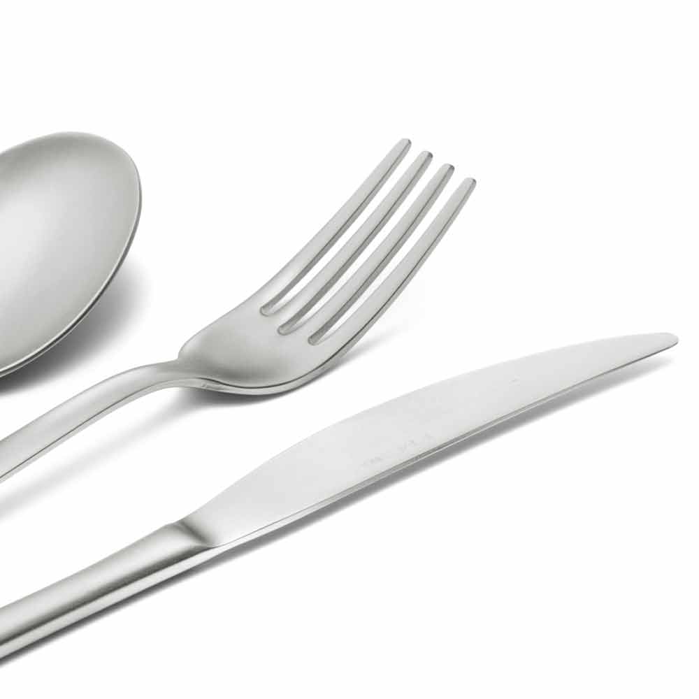 Conjunto completo de talheres em aço inoxidável jateado, 24 peças com design made in Italy.