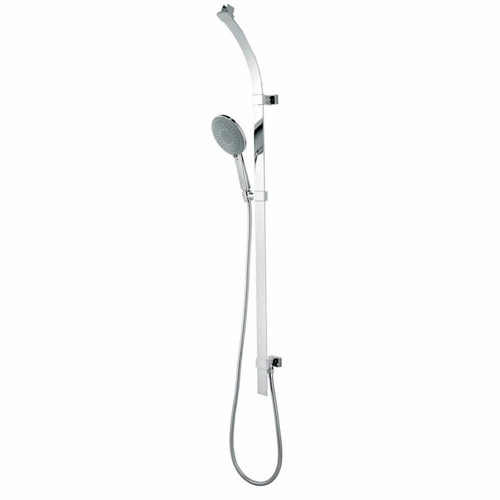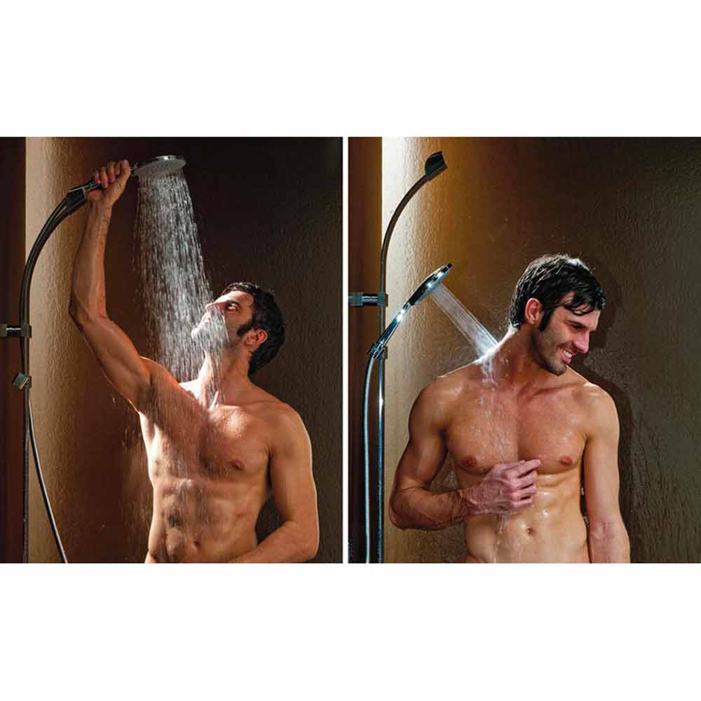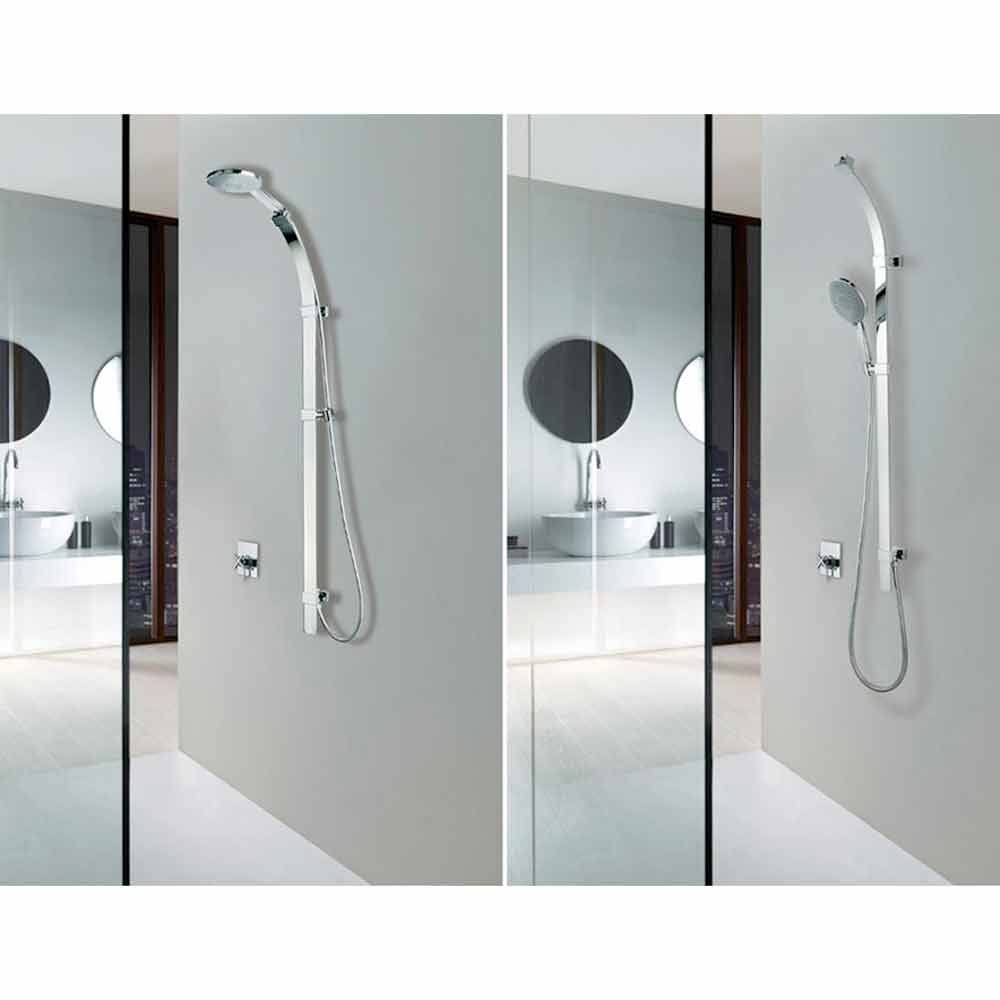 Trilho lateral de latão FLAT 120 cm com suportes de parede reguláveis (máx. Distância de fixação 85 cm), suporte inferior com saída de água incorporada, chuveiro MIXA / 3 FITAIR Ø 140 mm, mangueira flexível em latão duplo 150 cm, cone 1/2 FF.