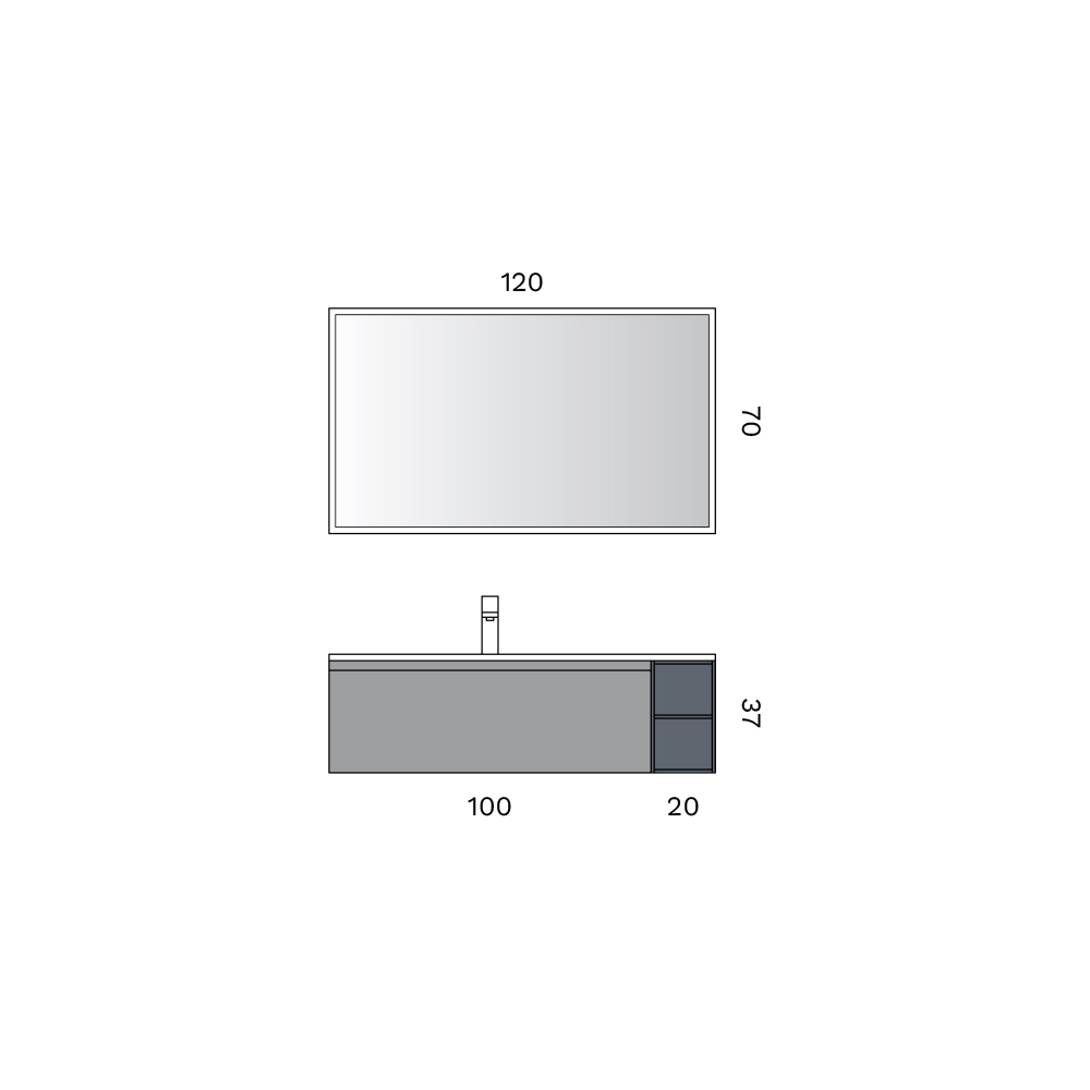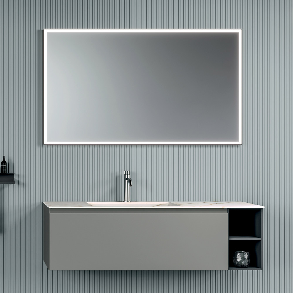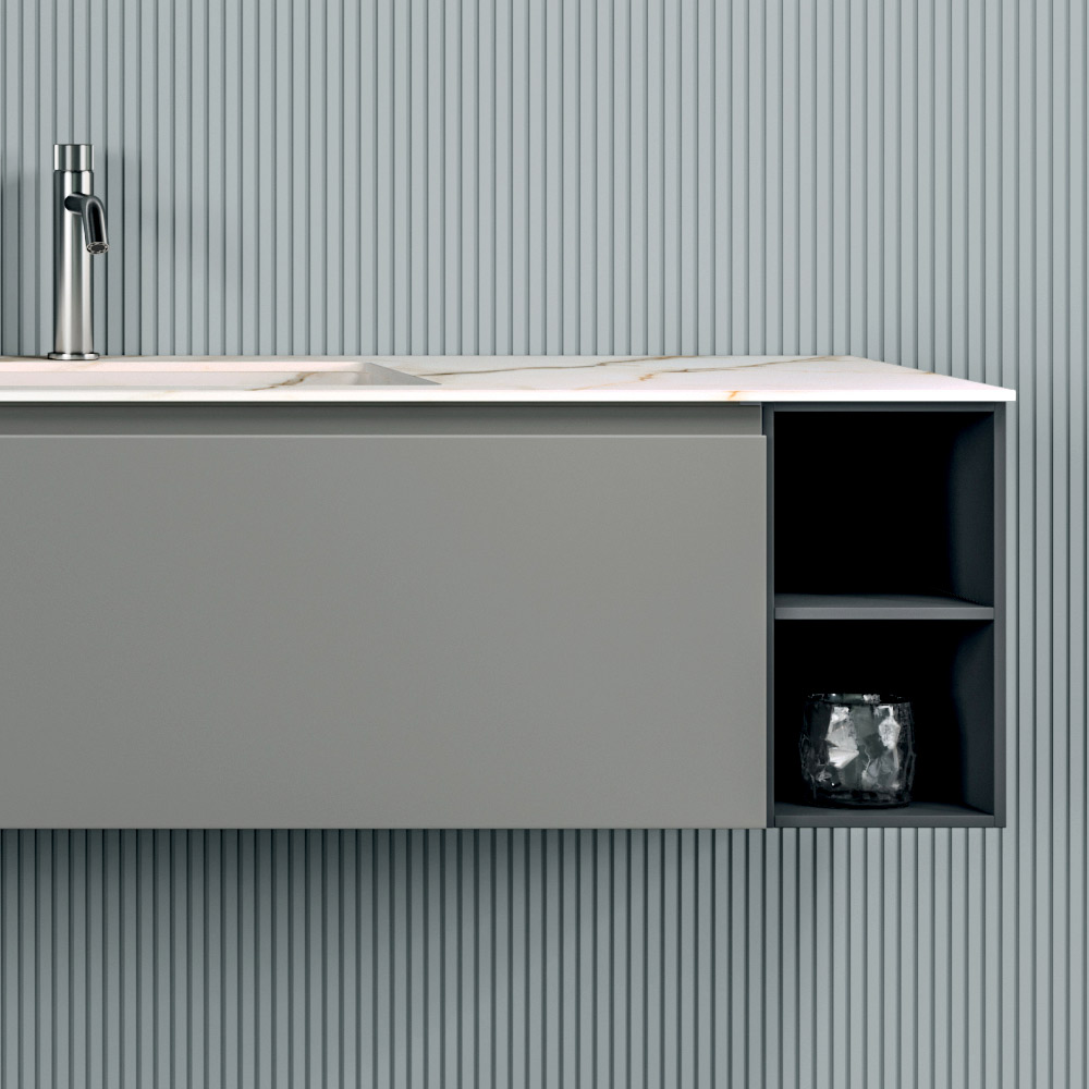 A composição expressa elegância contemporânea com linhas limpas, volumes suspensos e materiais de alta qualidade. Uma peça de mobiliário para banheiro projetada para espaços refinados, onde o design encontra a funcionalidade do dia a dia.