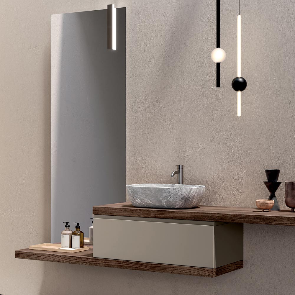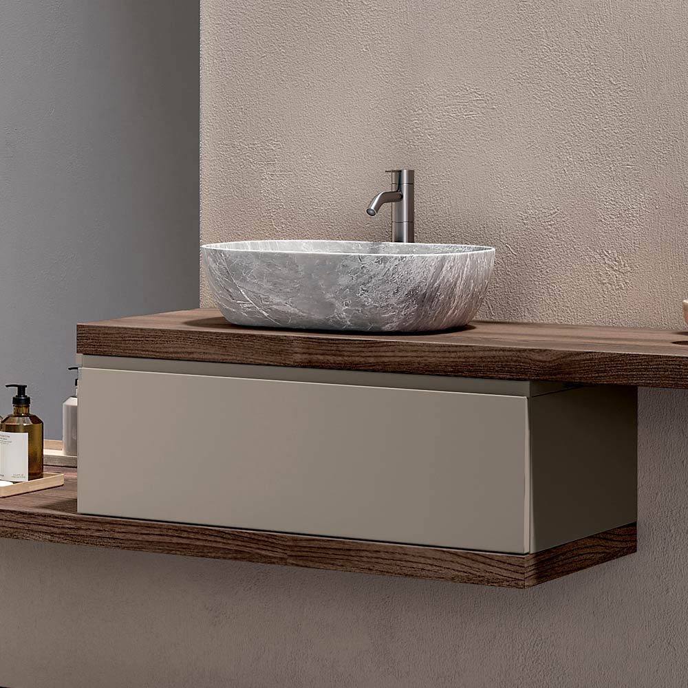 Uma solução completa para banheiro, projetada para quem deseja um armário suspenso moderno , caracterizado por acabamentos aconchegantes, contrastes delicados e uma forte identidade estética.