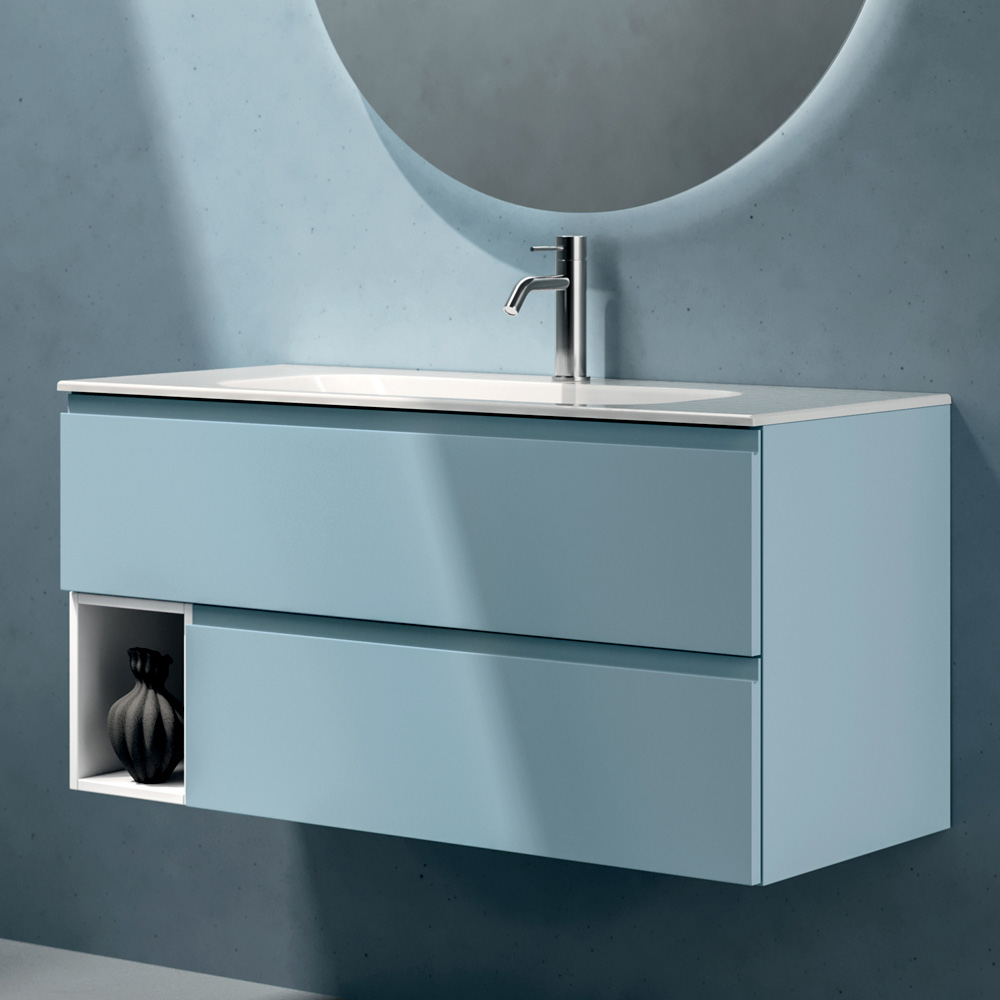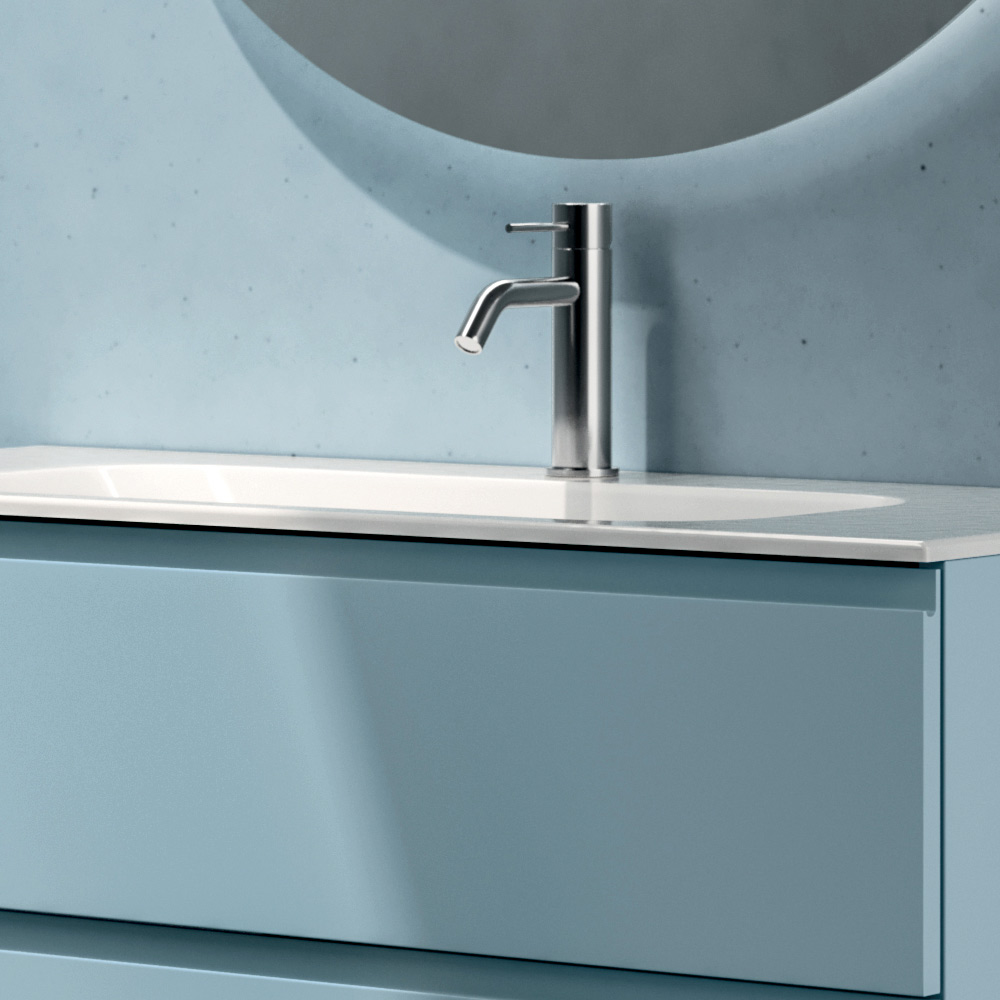 A composição oferece uma interpretação fresca e contemporânea de mobiliário de banheiro, caracterizada por volumes suspensos, acabamentos foscos e tons delicados que trazem luminosidade e leveza ao espaço.