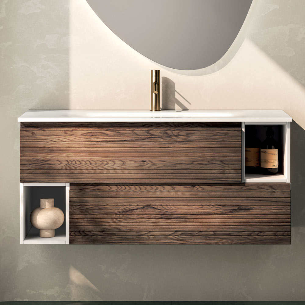 Uma elegante composição suspensa para banheiro que combina o aconchego da madeira com linhas limpas e contemporâneas, projetada para espaços sofisticados com forte personalidade.
