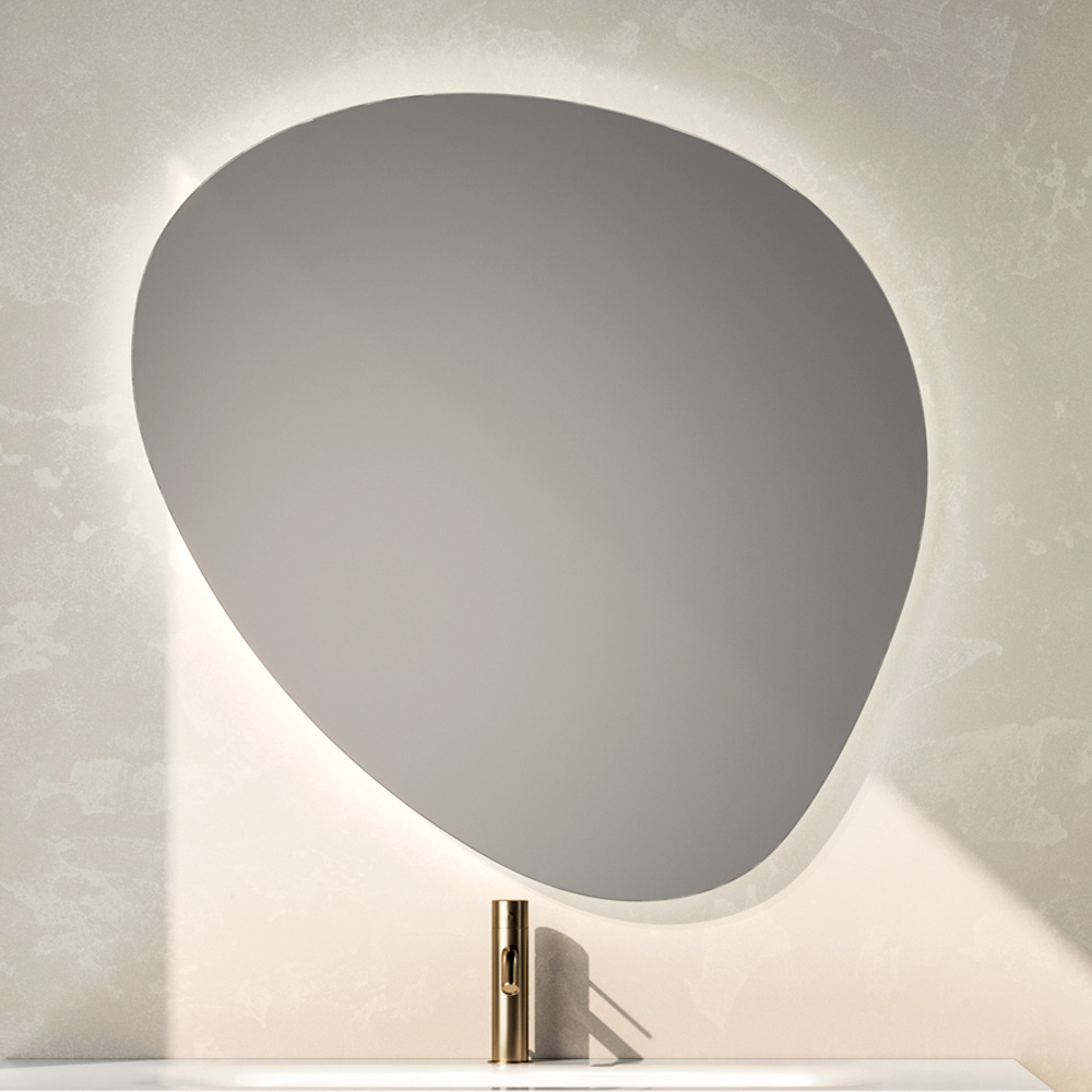O espelho LED com formato diferenciado se torna um verdadeiro elemento de decoração: seu formato suave e a iluminação integrada criam um jogo de luz refinado que amplia a percepção do espaço e confere profundidade ao banheiro.