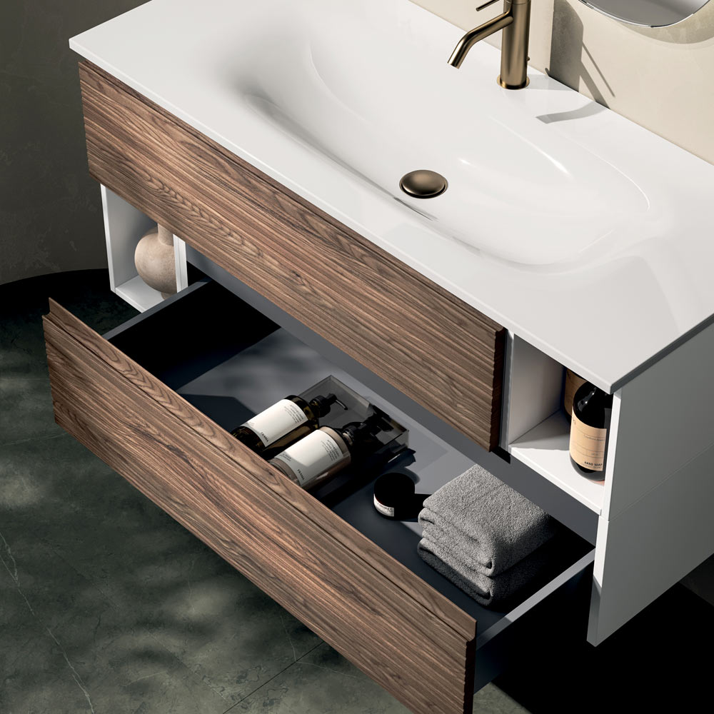 O móvel de banheiro suspenso Rio em carvalho destaca-se pela sua textura natural e proporções equilibradas, oferecendo uma solução funcional e, ao mesmo tempo, marcante. As gavetas, uma das quais equipada com sifão, garantem praticidade e organização, mantendo uma estética minimalista e elegante.
