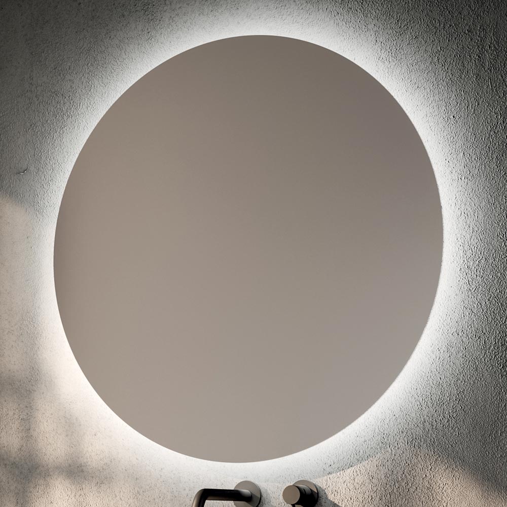 A pia redonda de resina , com seu perfil suave e minimalista, integra-se perfeitamente à bancada, enquanto o espelho retroiluminado amplifica o brilho e confere profundidade visual à parede, ajudando a criar uma atmosfera moderna e relaxante.