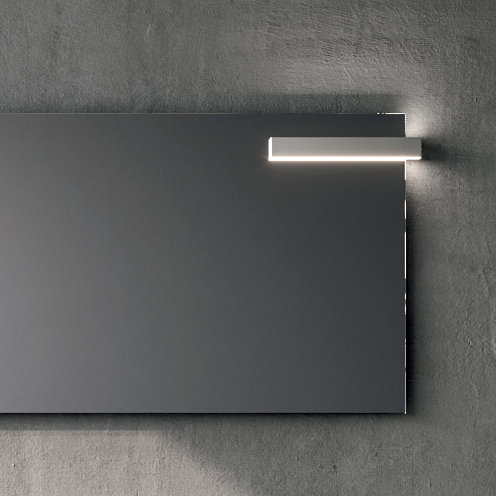 O espelho retangular com iluminação LED garante uma luz uniforme e funcional, perfeita para as atividades do dia a dia, além de ajudar a realçar as linhas retas e a profundidade do ambiente.