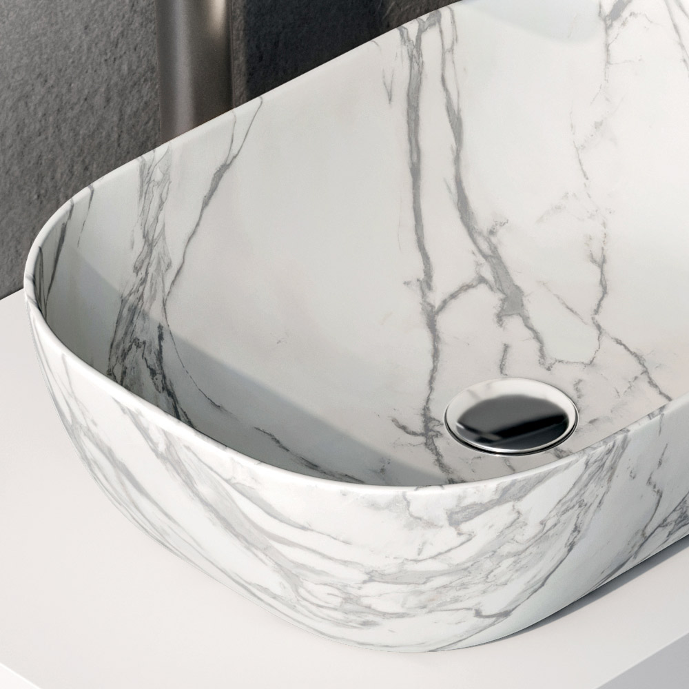 A bancada branca fosca harmoniza-se perfeitamente com a cuba de cerâmica com efeito Calacatta , caracterizada por uma superfície luminosa e veios delicados que lembram o mármore, valorizando toda a composição.