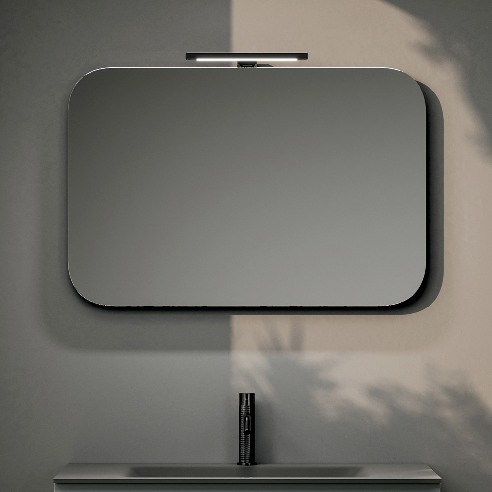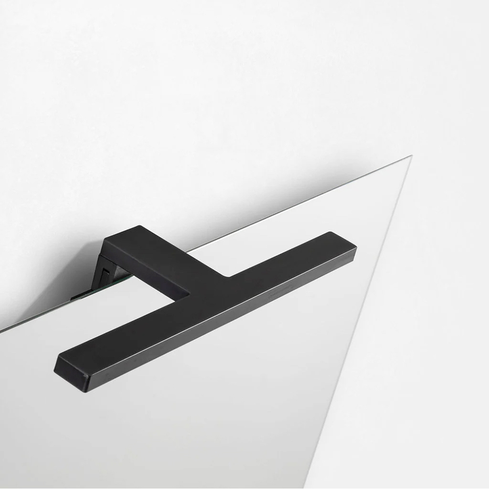 A luminária LED preta completa a composição com um toque gráfico arrojado, oferecendo iluminação funcional e cenográfica, ideal para criar uma atmosfera íntima e sofisticada na área da pia.
