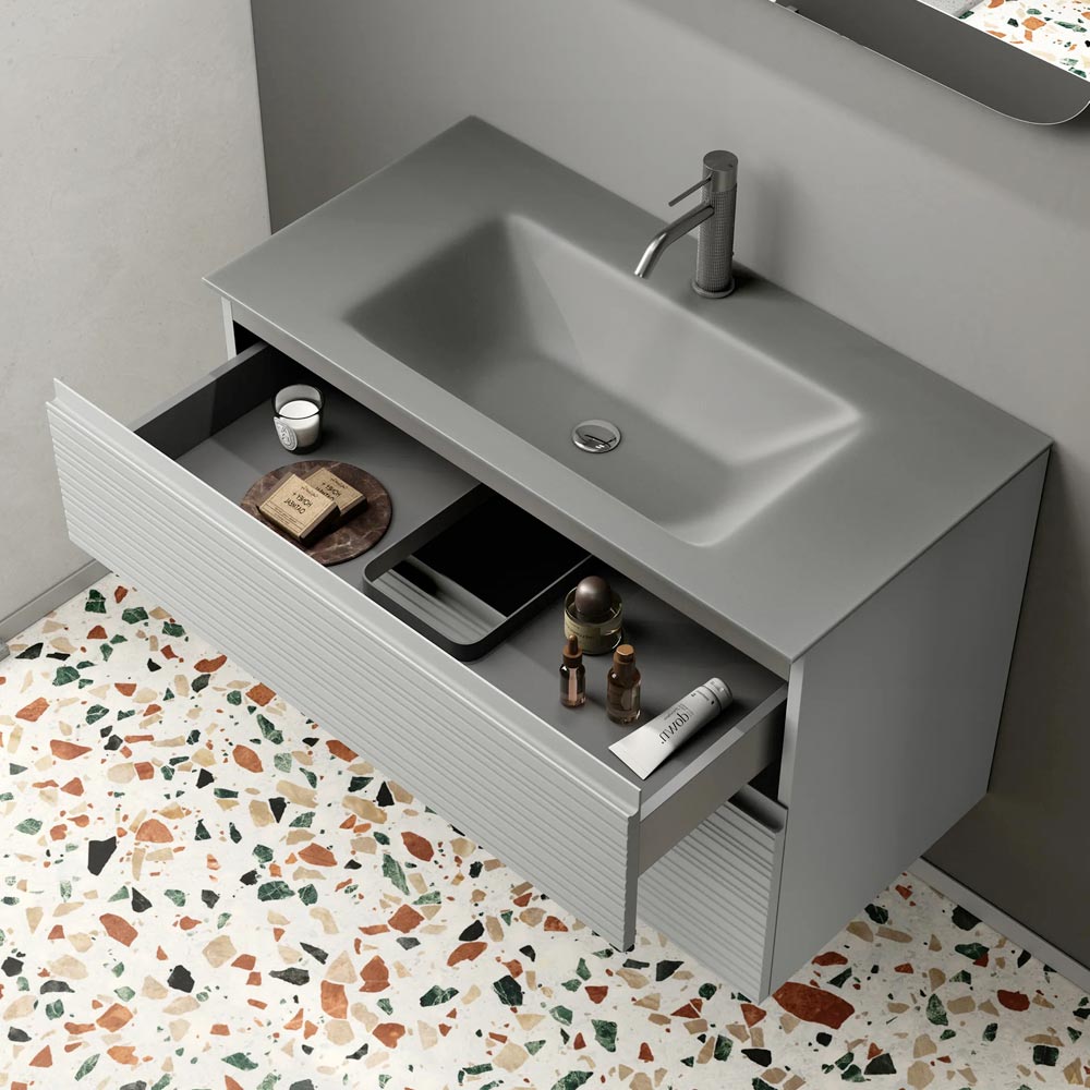 O armário de banheiro suspenso com gavetas , com um sofisticado acabamento cinza fosco , combina estética minimalista e funcionalidade, oferecendo um espaço de armazenamento prático e bem organizado. As superfícies texturizadas conferem profundidade visual e uma elegância discreta ao ambiente.