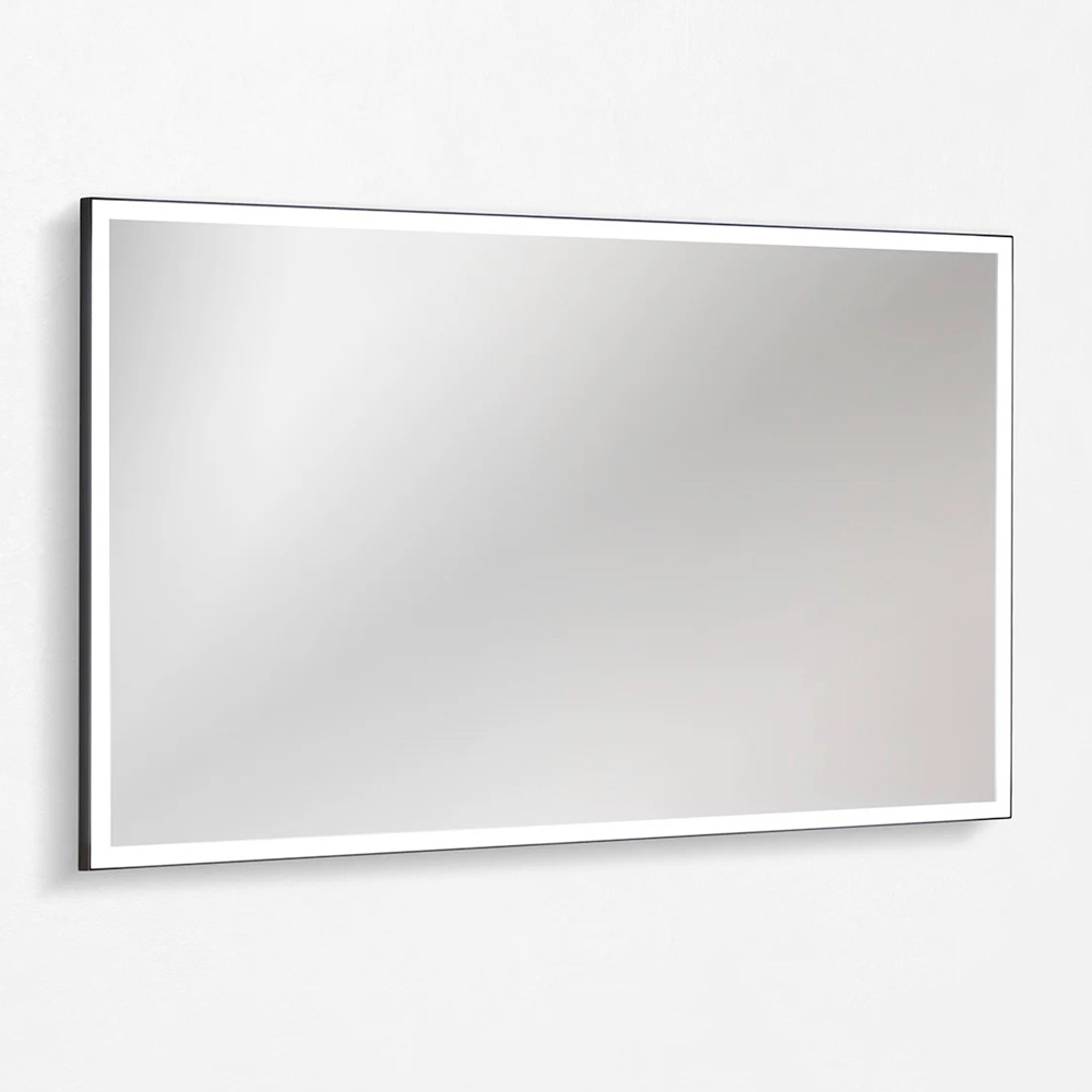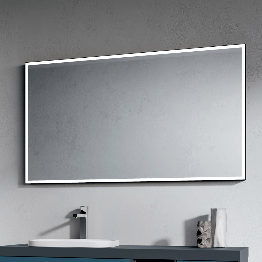 O espelho LED preto fosco de 120x70 completa o conjunto, com uma presença elegante e minimalista que realça a iluminação do banheiro e ajuda a criar uma atmosfera sofisticada e contemporânea.