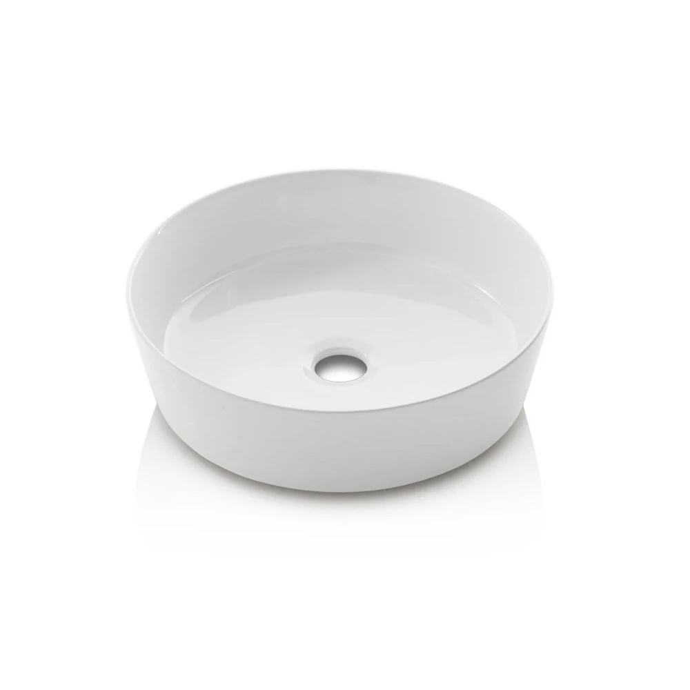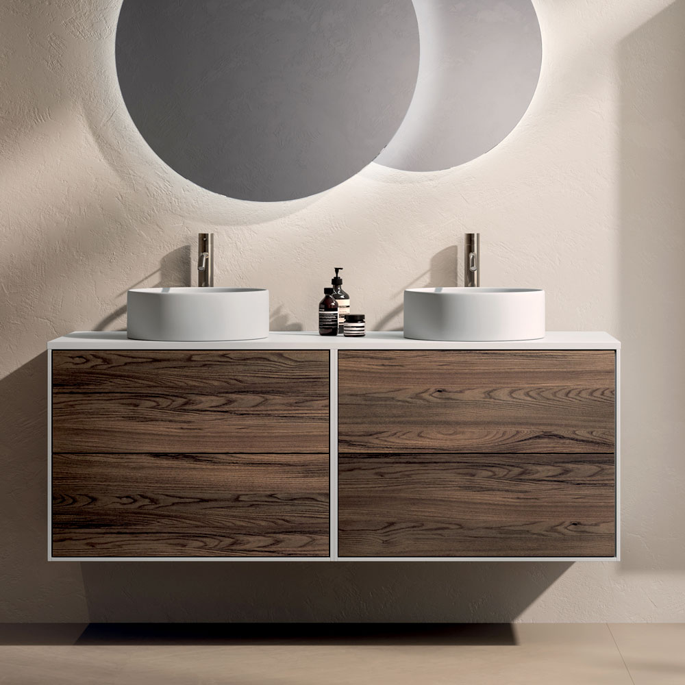 As cubas redondas de cerâmica branca brilhante emergem elegantemente da superfície, realçando a leveza visual do design geral e oferecendo uma solução ideal para espaços compartilhados. As formas suaves interagem harmoniosamente com as linhas retas do armário suspenso.