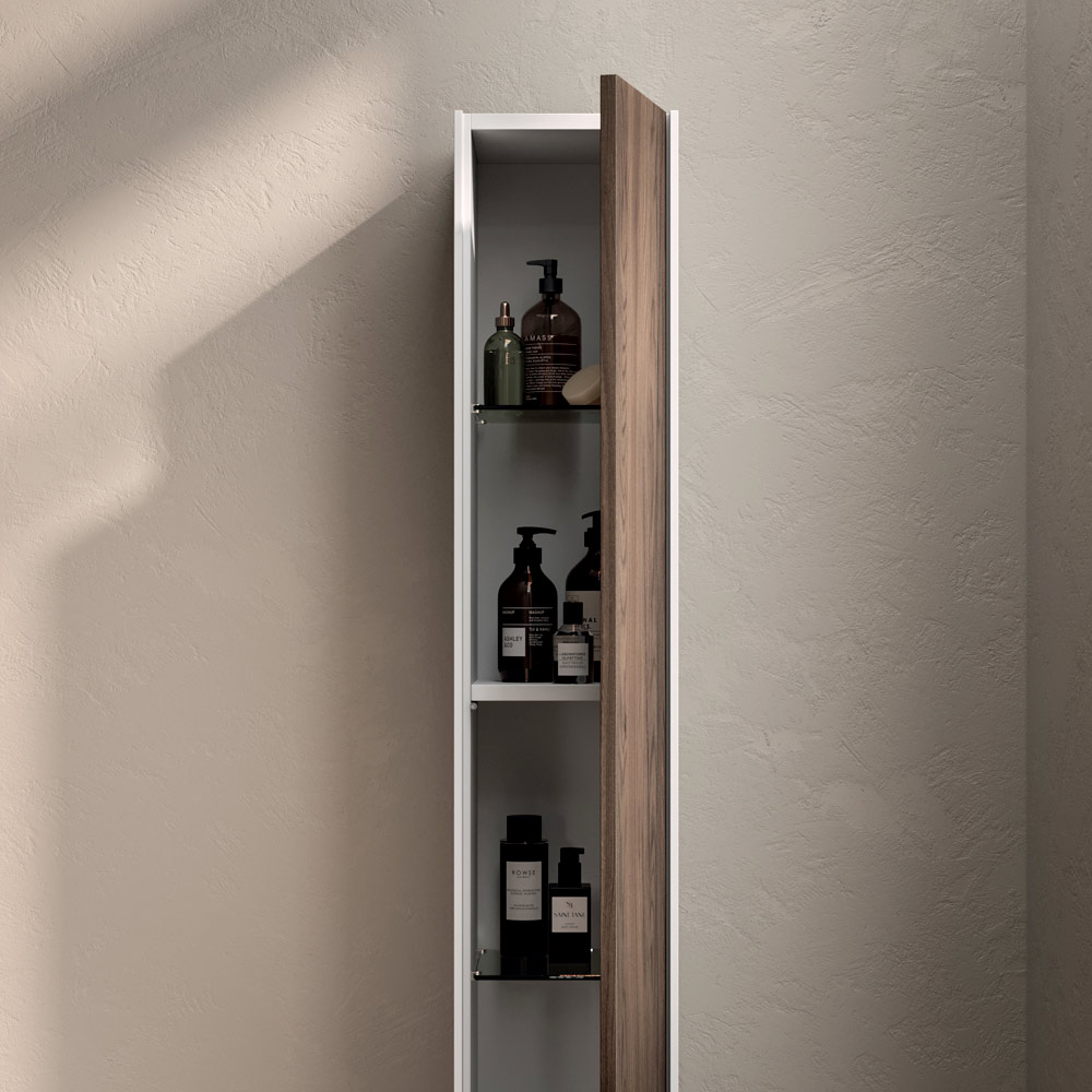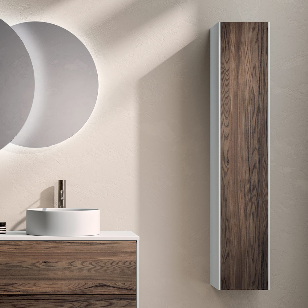 A coluna correspondente completa a composição, adicionando verticalidade e ordem a um projeto de banheiro concebido para aqueles que desejam elegância, praticidade e coerência estética.
