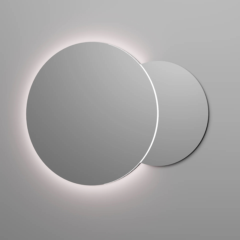 Os dois espelhos retroiluminados amplificam a luminosidade do espaço, criando uma atmosfera sofisticada e envolvente. A iluminação integrada define os volumes e contribui para um ambiente moderno e funcional.