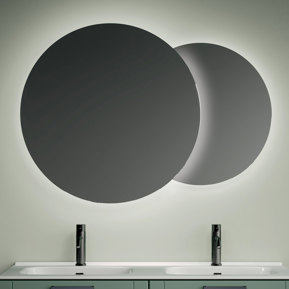 Os espelhos redondos retroiluminados completam a composição com um efeito de iluminação sugestivo, ampliando a percepção do espaço e criando uma atmosfera envolvente e contemporânea.