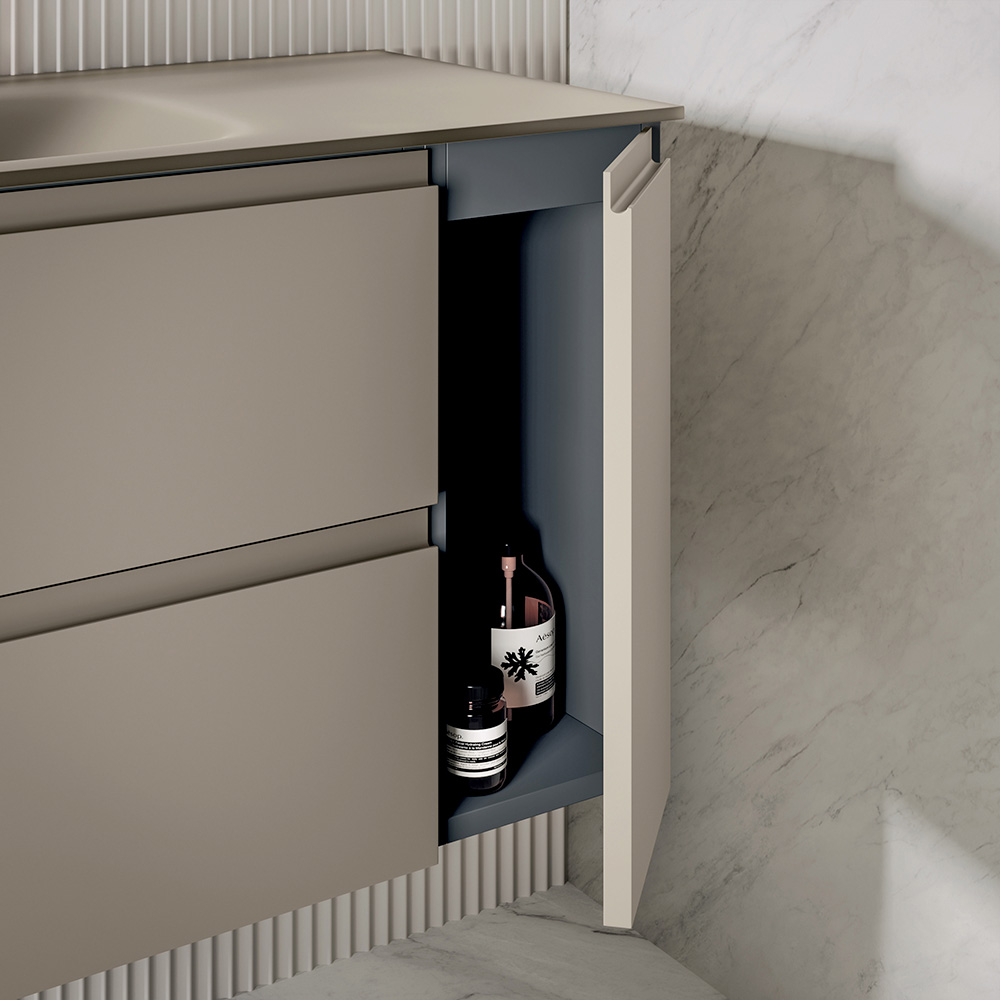 O módulo de base de 120 cm com duas gavetas e uma porta lateral direita, com acabamento em cinza-pombo fosco, oferece amplo espaço de armazenamento, mantendo uma estética refinada e contemporânea. A configuração de portas integradas garante maior funcionalidade e organização do espaço interno.