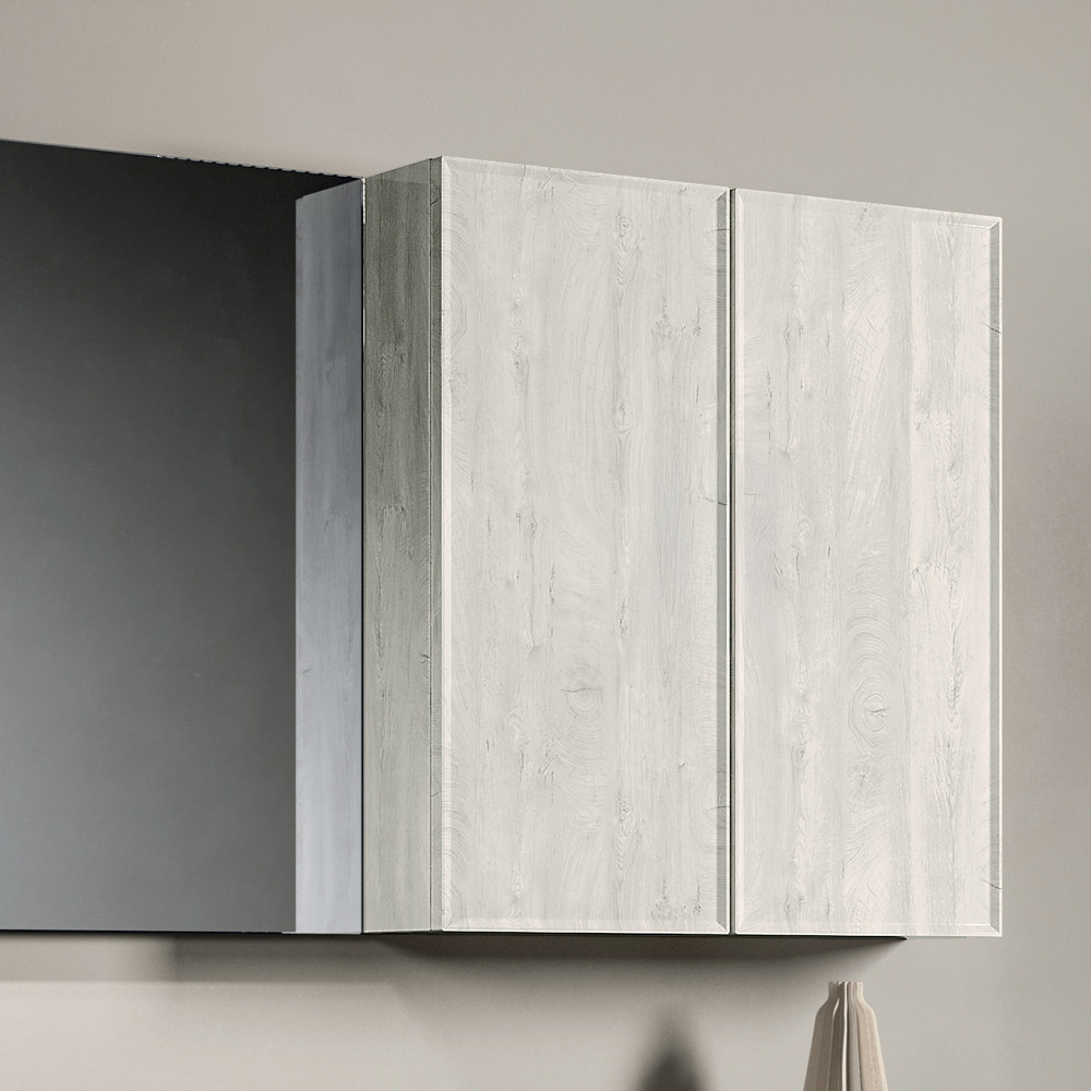 O armário suspenso para banheiro em carvalho Alaska destaca-se pelo seu acabamento claro e natural, que realça a luminosidade do ambiente e se adapta perfeitamente a decorações contemporâneas e minimalistas.
