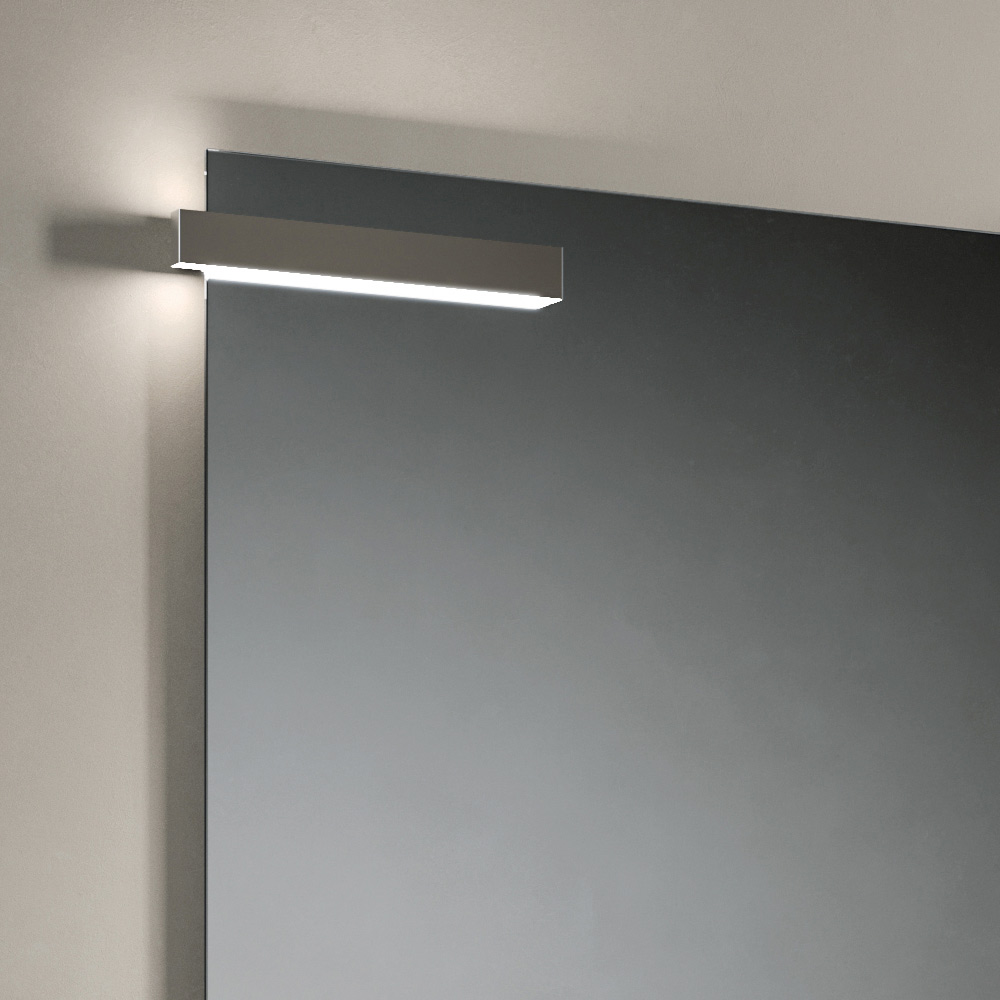 A composição é complementada pelo espelho retangular e pela lâmpada LED , que garantem uma iluminação funcional e cenográfica, ideal para valorizar a área da pia e melhorar o conforto visual.