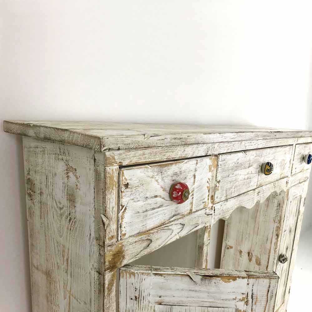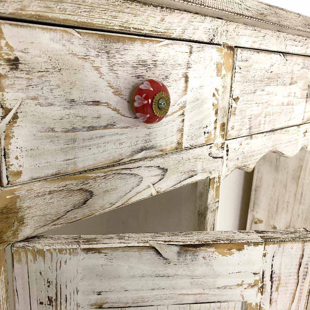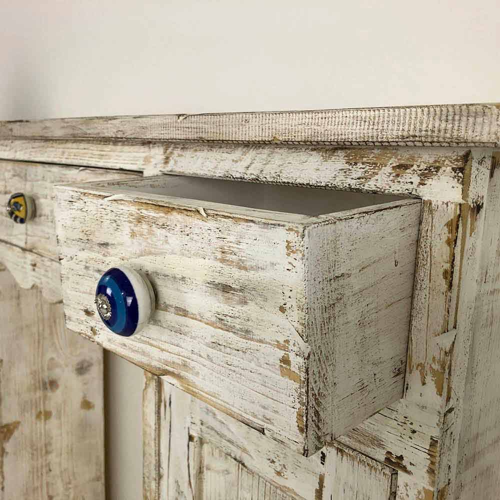 Console em madeira maciça de abeto inteiramente feito à mão na Itália e caracterizado pelo maravilhoso acabamento esfolado queimado à chama e caiado de branco. A sua estrutura inclui 2 portas com prateleiras interiores e 3 gavetas que se completam com puxadores especiais de cerâmica pintados à mão que permitem organizar os espaços na perfeição.