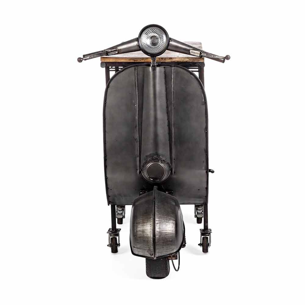 Esta consola de design tem a estrutura com o formato particular de uma motocicleta em aço , enquanto a parte superior é em madeira de manga e inclui porta-garrafas e porta-copos.