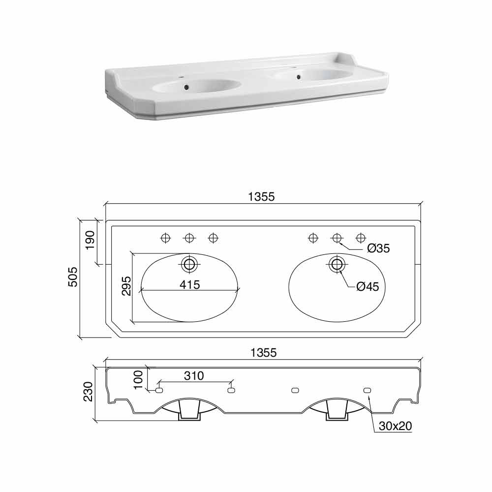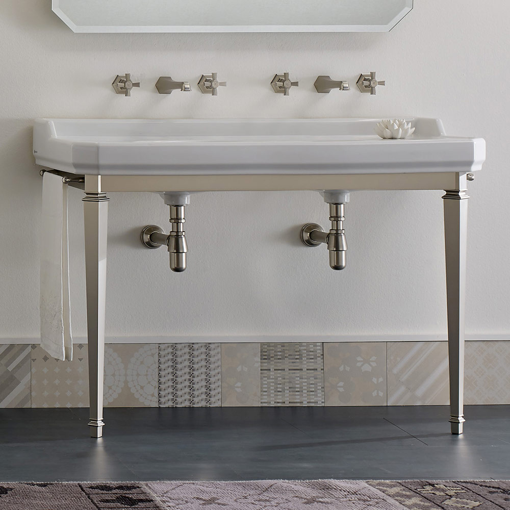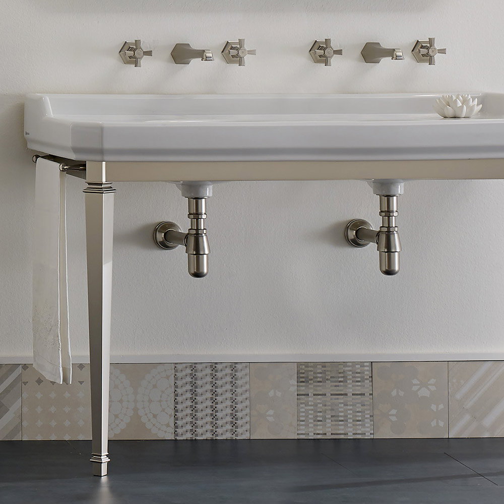 1 ou 3 orifícios por bacia (especifique o número de orifícios necessários no momento do pedido), 1350 mm de comprimento, apoiado por uma estrutura composta por pés de metal no acabamento níquel .