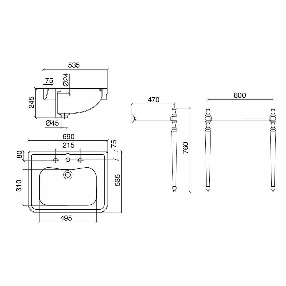 1 ou 3 furos (especifique ao fazer o pedido) e tem 650 mm de comprimento. A base é feita de metal com acabamento em níquel.