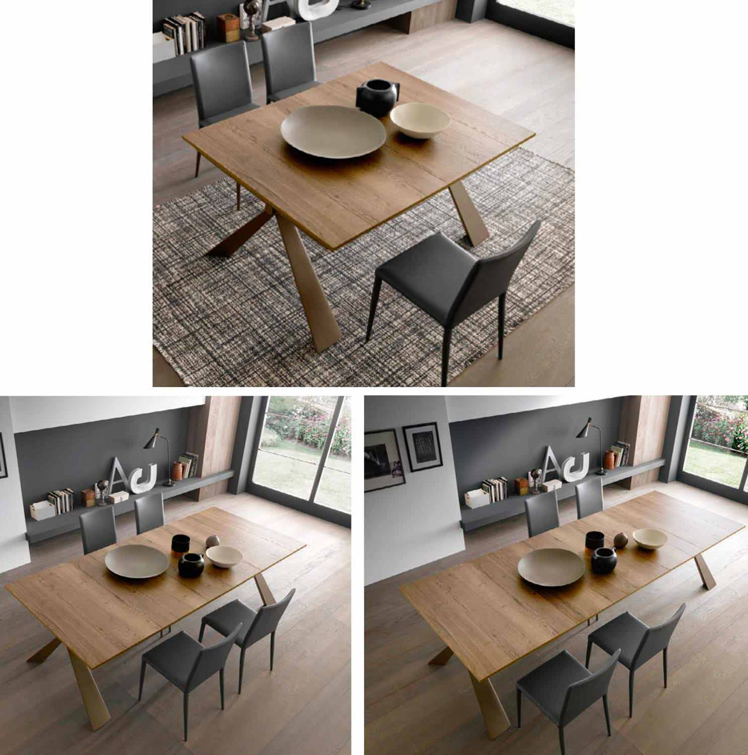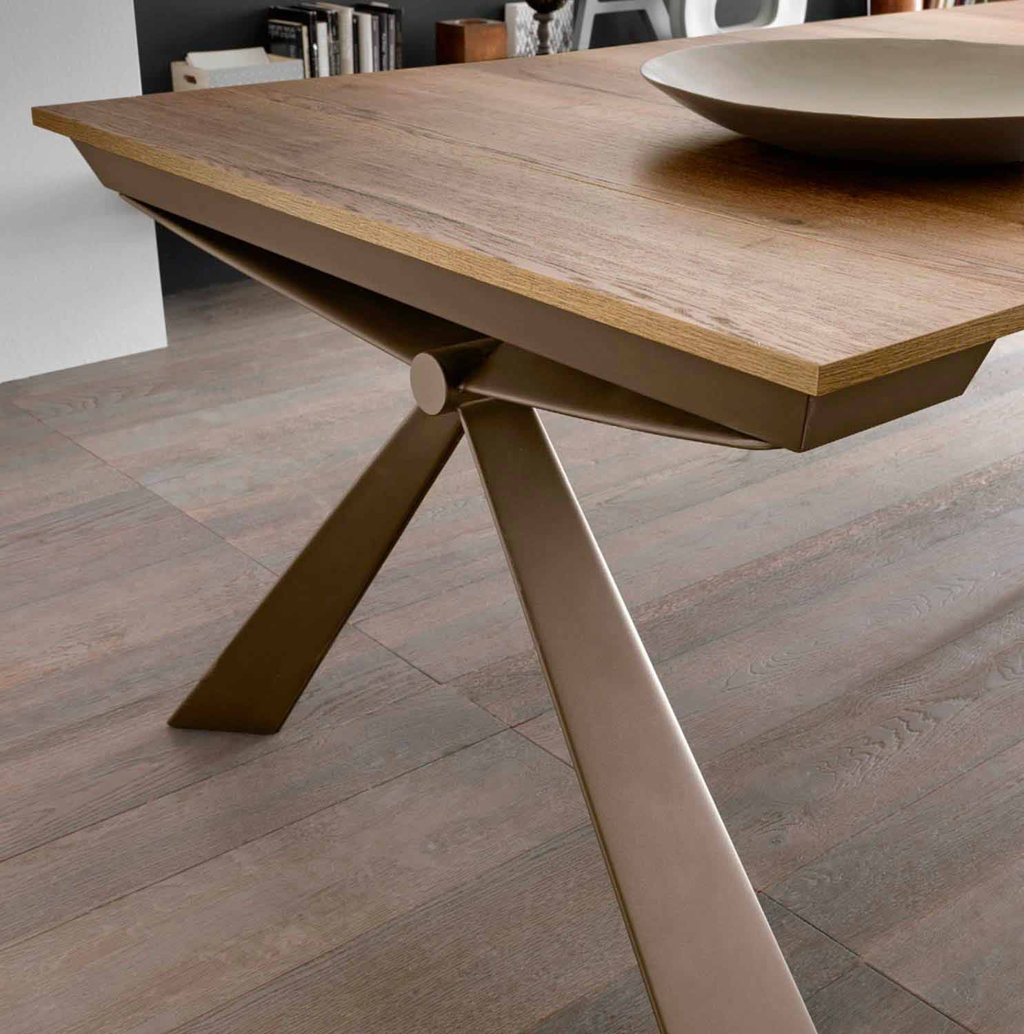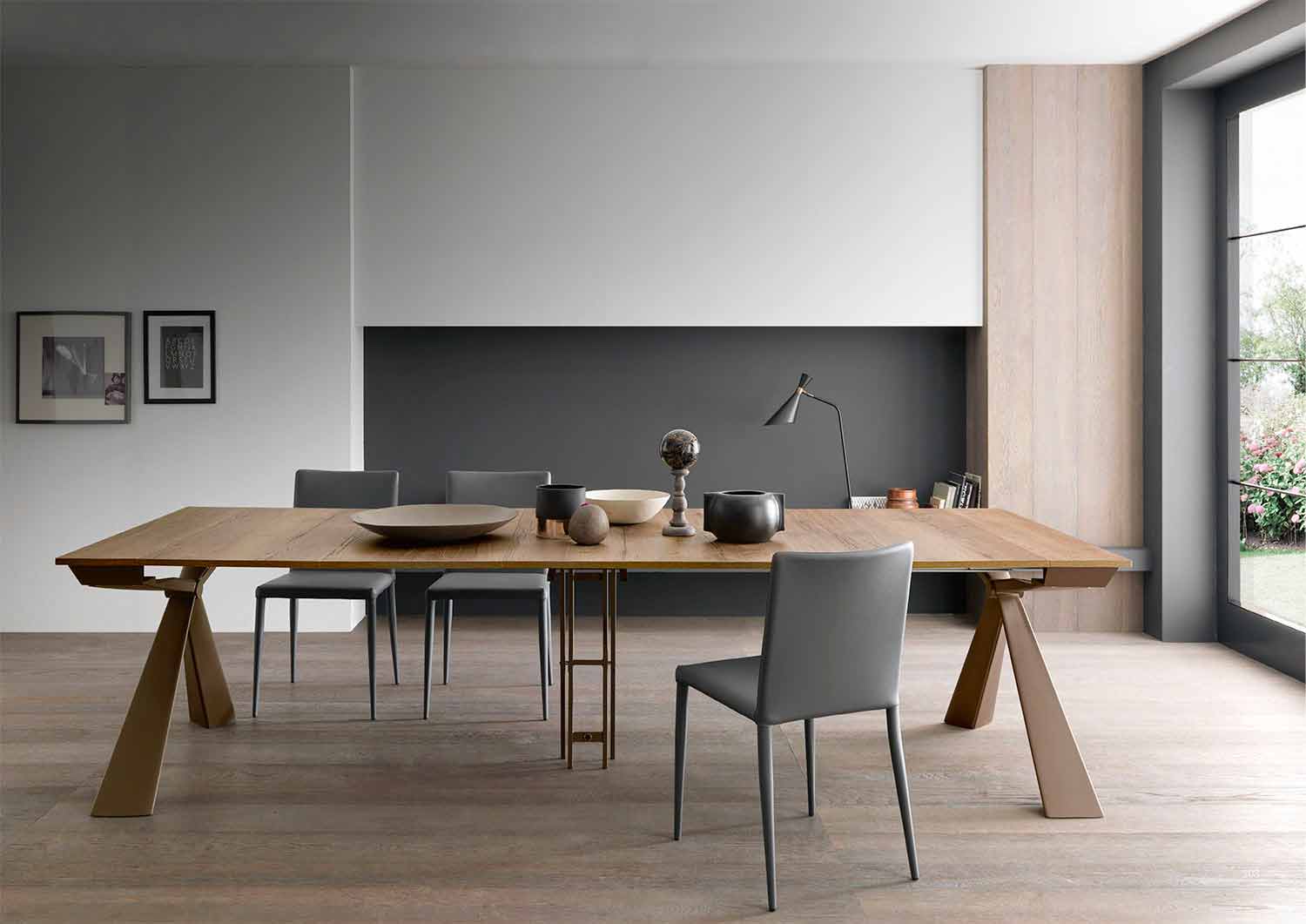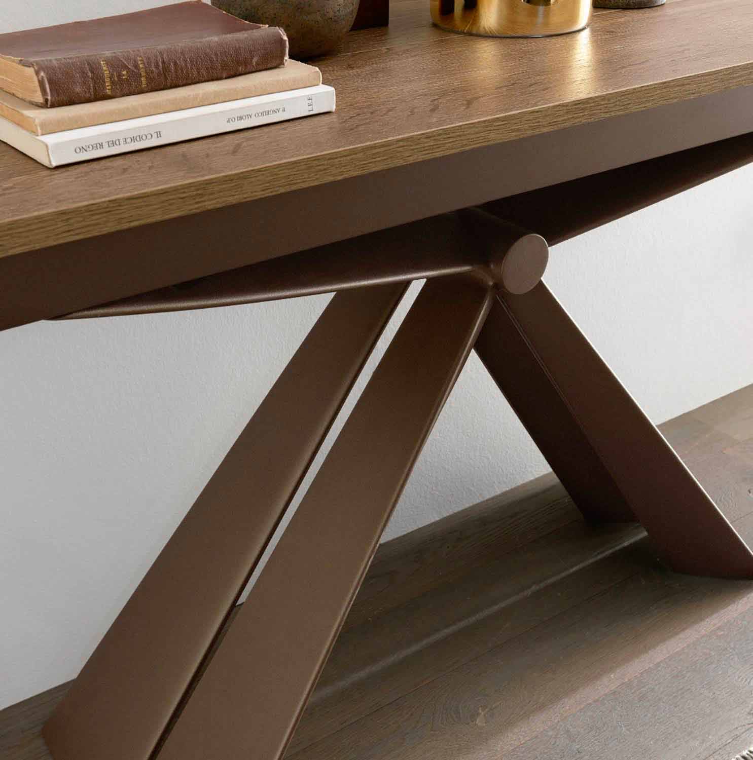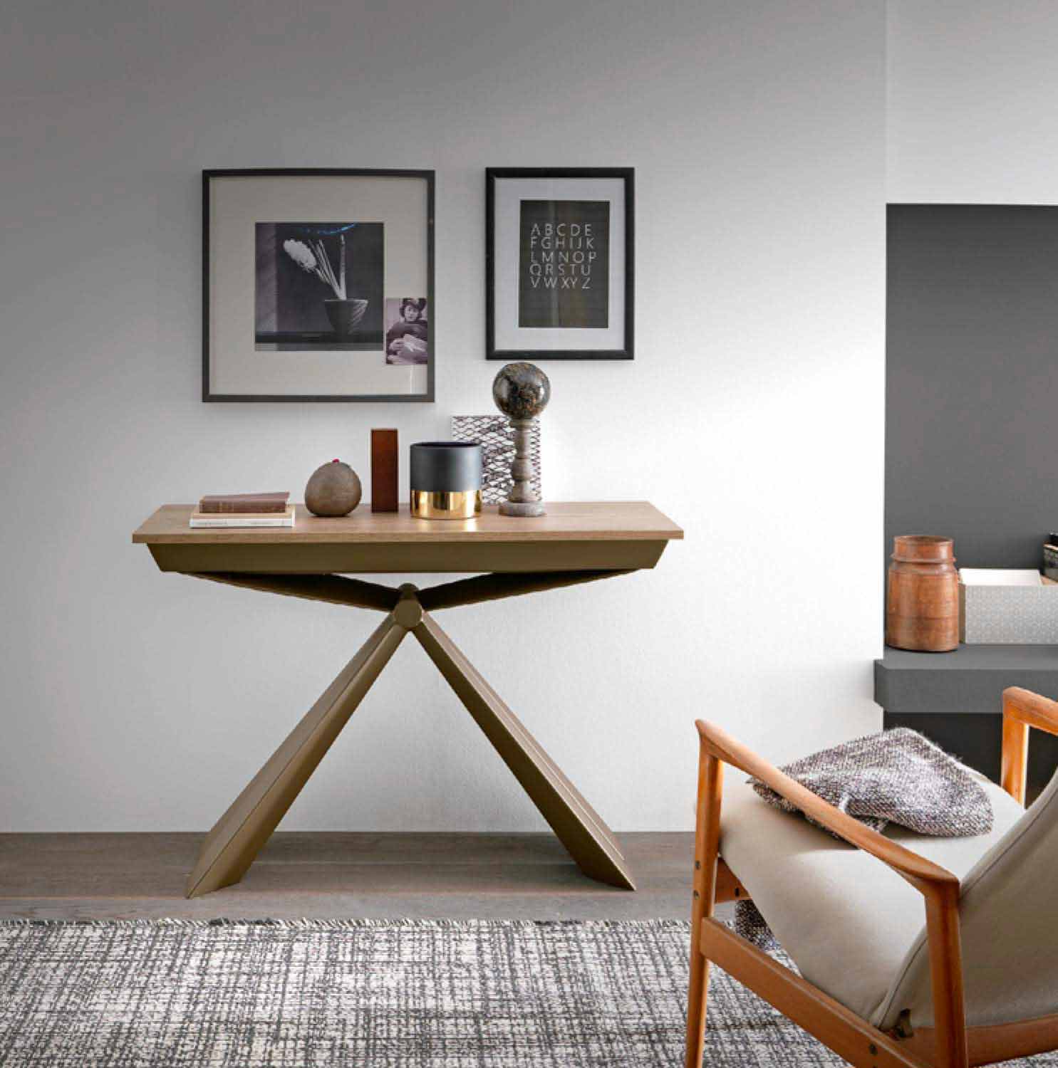 consola extensível é delineada por um desenho escultural graças à forma da estrutura metálica que converge as suas linhas num nó central.