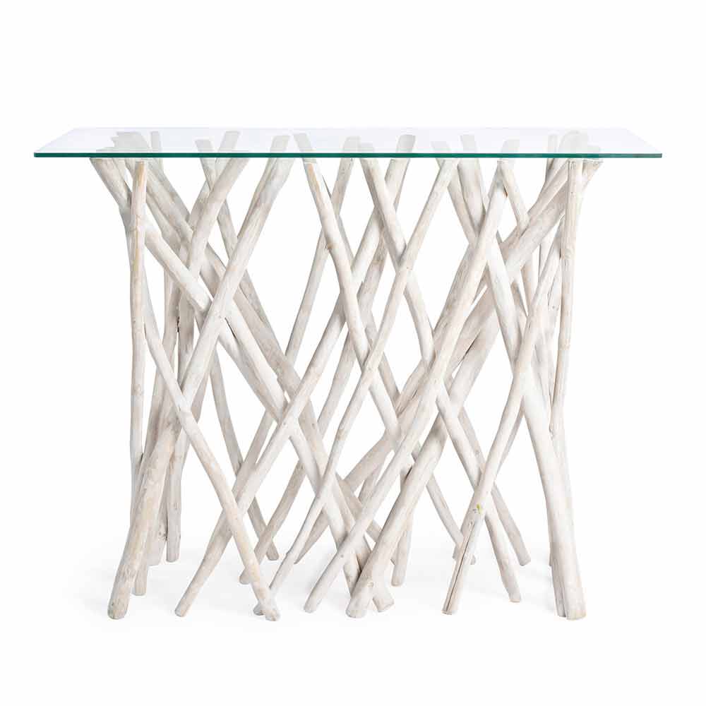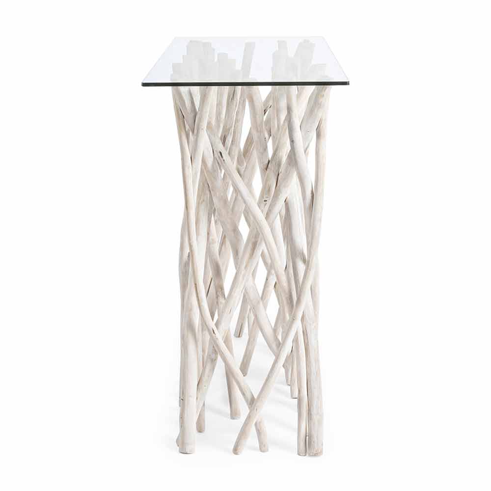 Esta consola de design é composta por um tampo em vidro não temperado de 8 mm de espessura, apoiado por uma base de ramos de teca branqueada com acabamento natural.