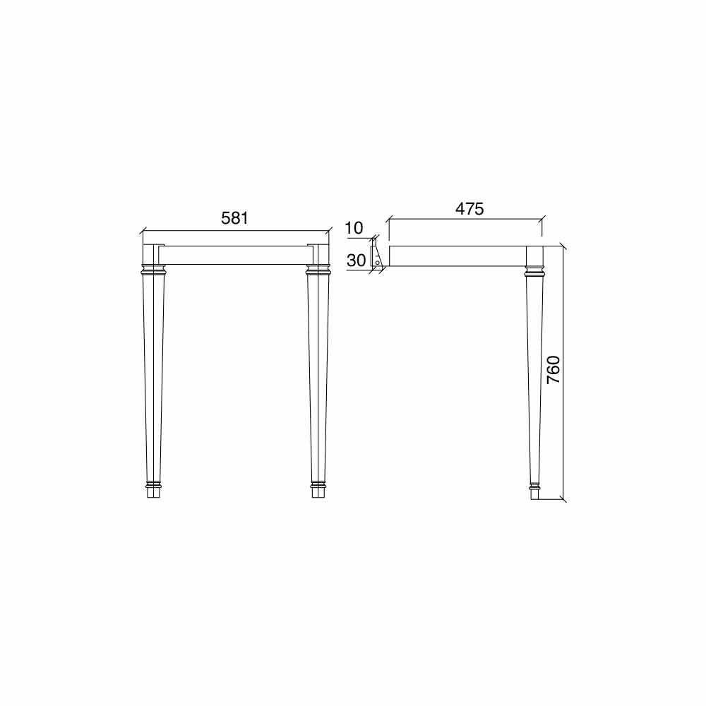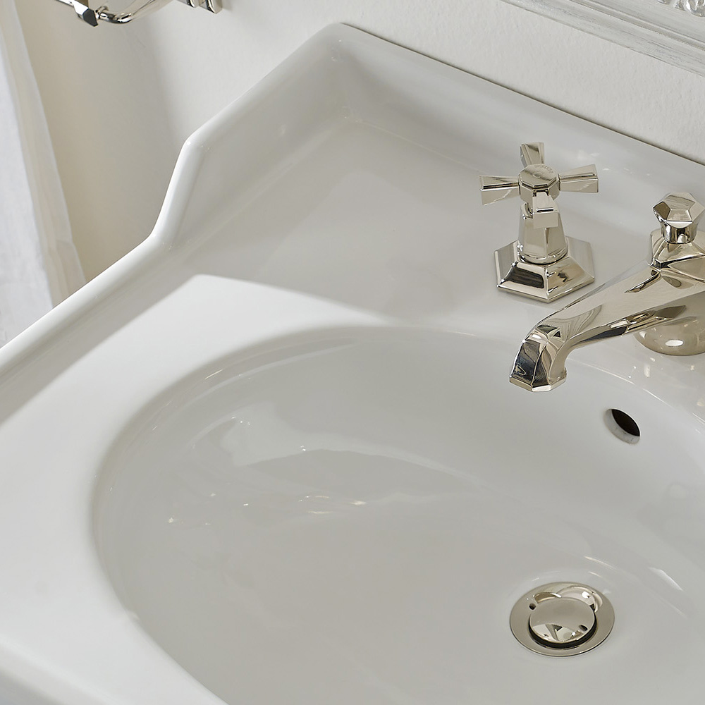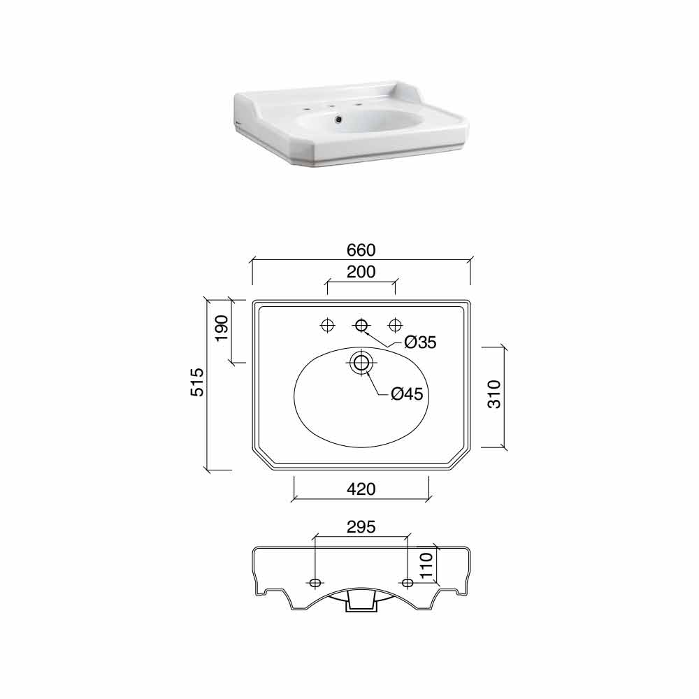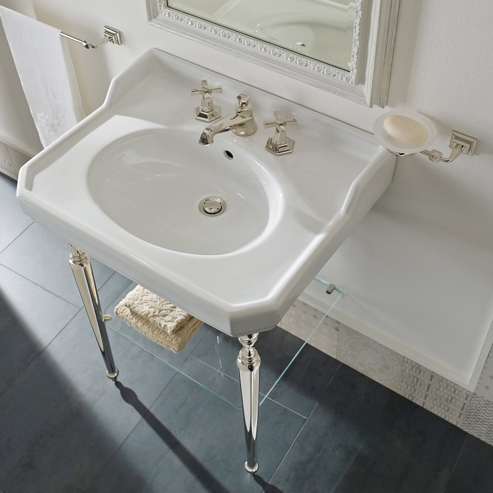 1 ou 3 furos para torneira (a especificar no pedido). O comprimento é de 650 mm. A base é feita de metal com acabamento em níquel.