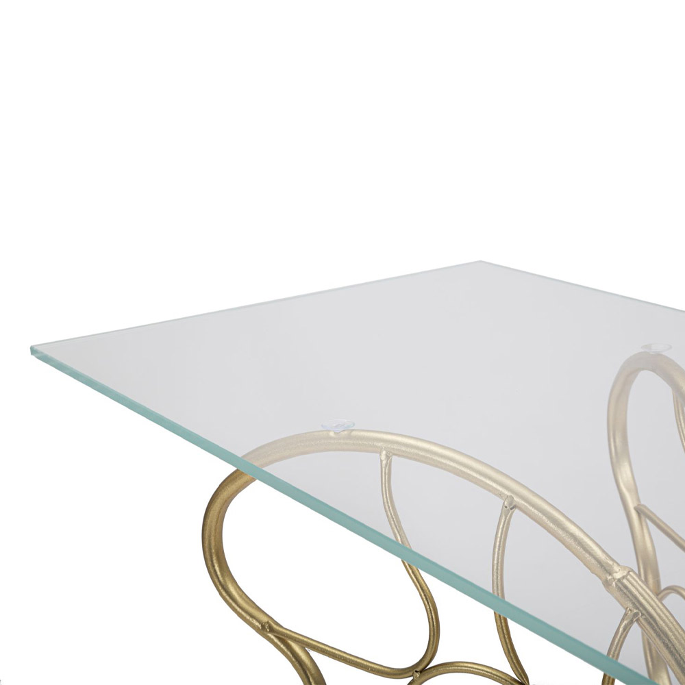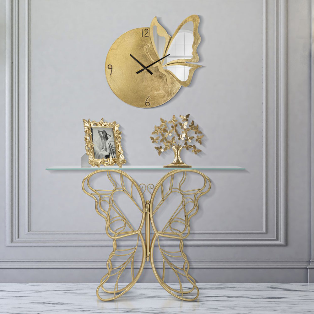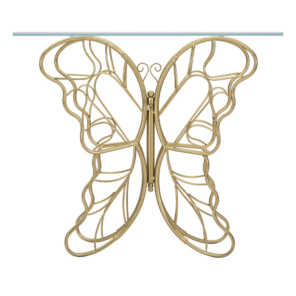 Consola fixa moderna com estrutura em ferro com acabamento dourado e tampo em vidro transparente . A estética e a funcionalidade unem-se para dar vida a um original acessório de decoração com alma romântica caracterizada pela conformação particular da base que recria a forma elegante de uma borboleta enriquecendo assim o design final do produto. A combinação perfeita entre o acabamento dourado da base e o toque sofisticado do tampo em vidro faz desta consola um elemento decorativo ideal para quem procura um estilo criativo e gosta de decorar o espaço da sua casa com objectos de forte personalidade requintada .