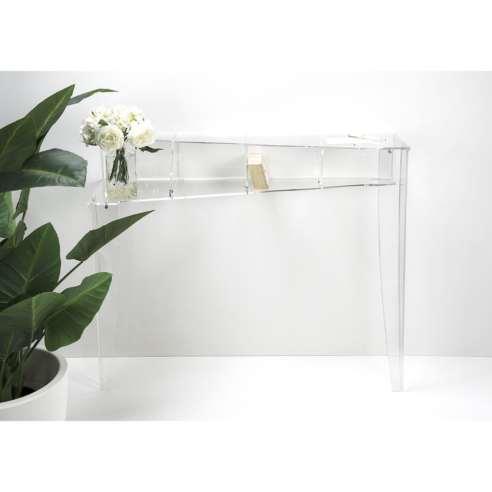 Fabricado em plexiglass 100% PMMA de polímero virgem transparente, é o móvel mais discreto e ao mesmo tempo funcional que vai enriquecer a entrada ou sala de estar.