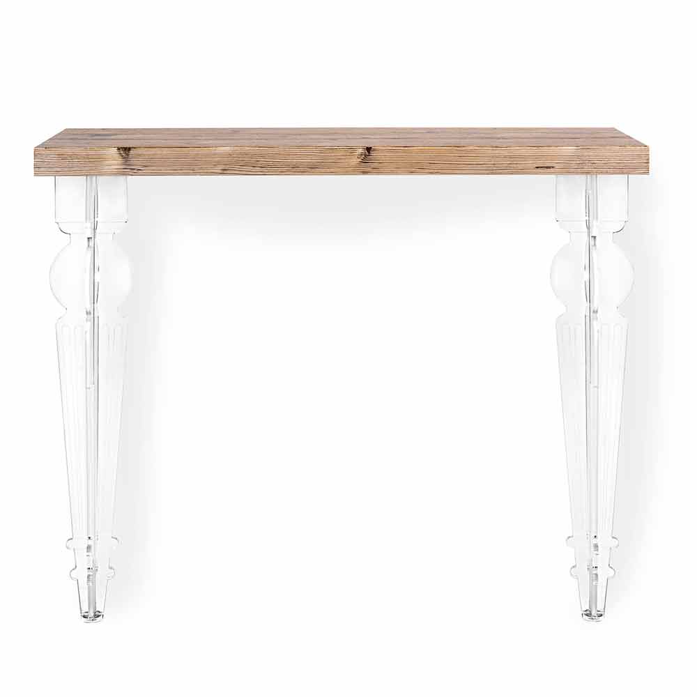 As pernas torneadas em plexiglass PMMA transparente de polímero virgem, cujo brilho e brilho são garantidos ao longo do tempo, são combinadas com a enobrecida essência de madeira do tampo, com acabamento natural escovado mate.