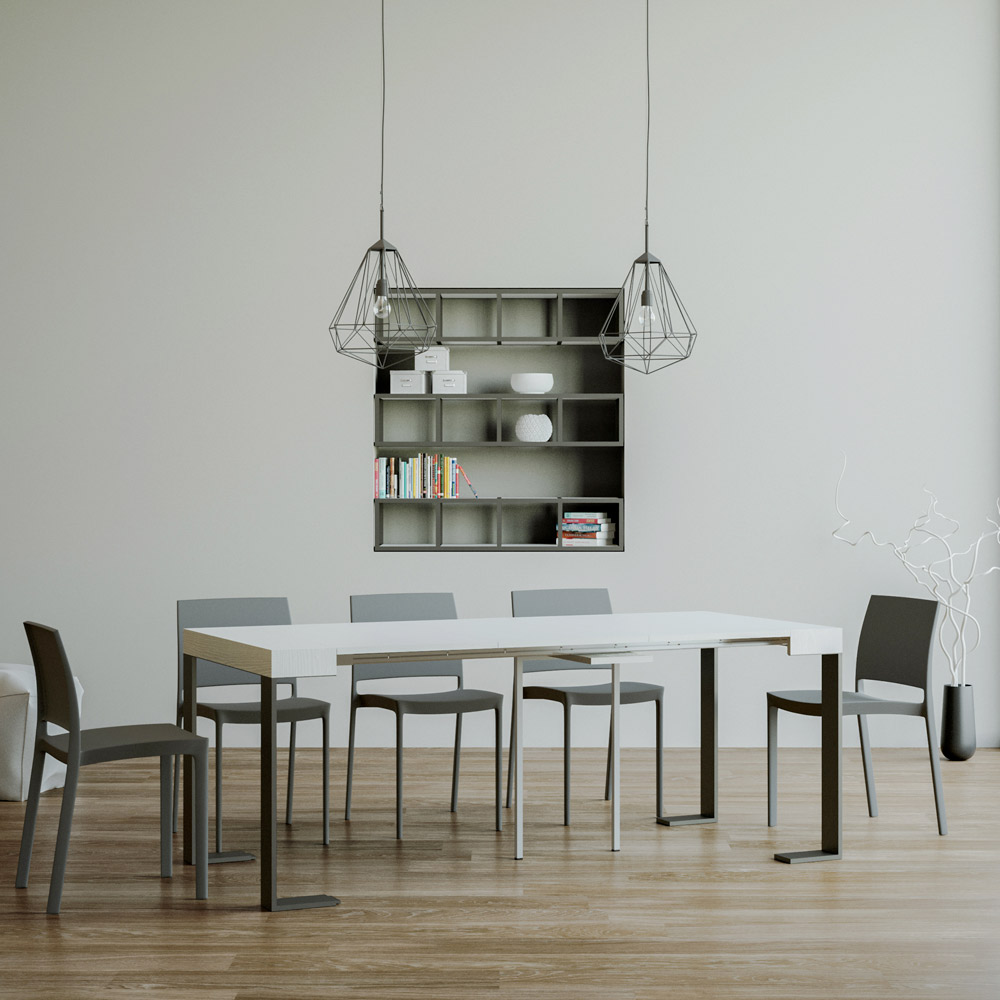Esta mesa de console extensível é um exemplo de design contemporâneo concebido para combinar elegância e praticidade.;