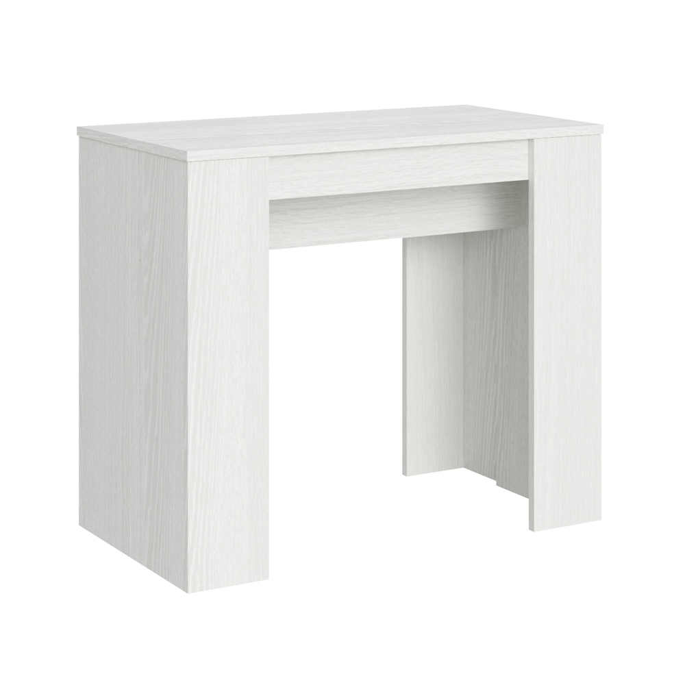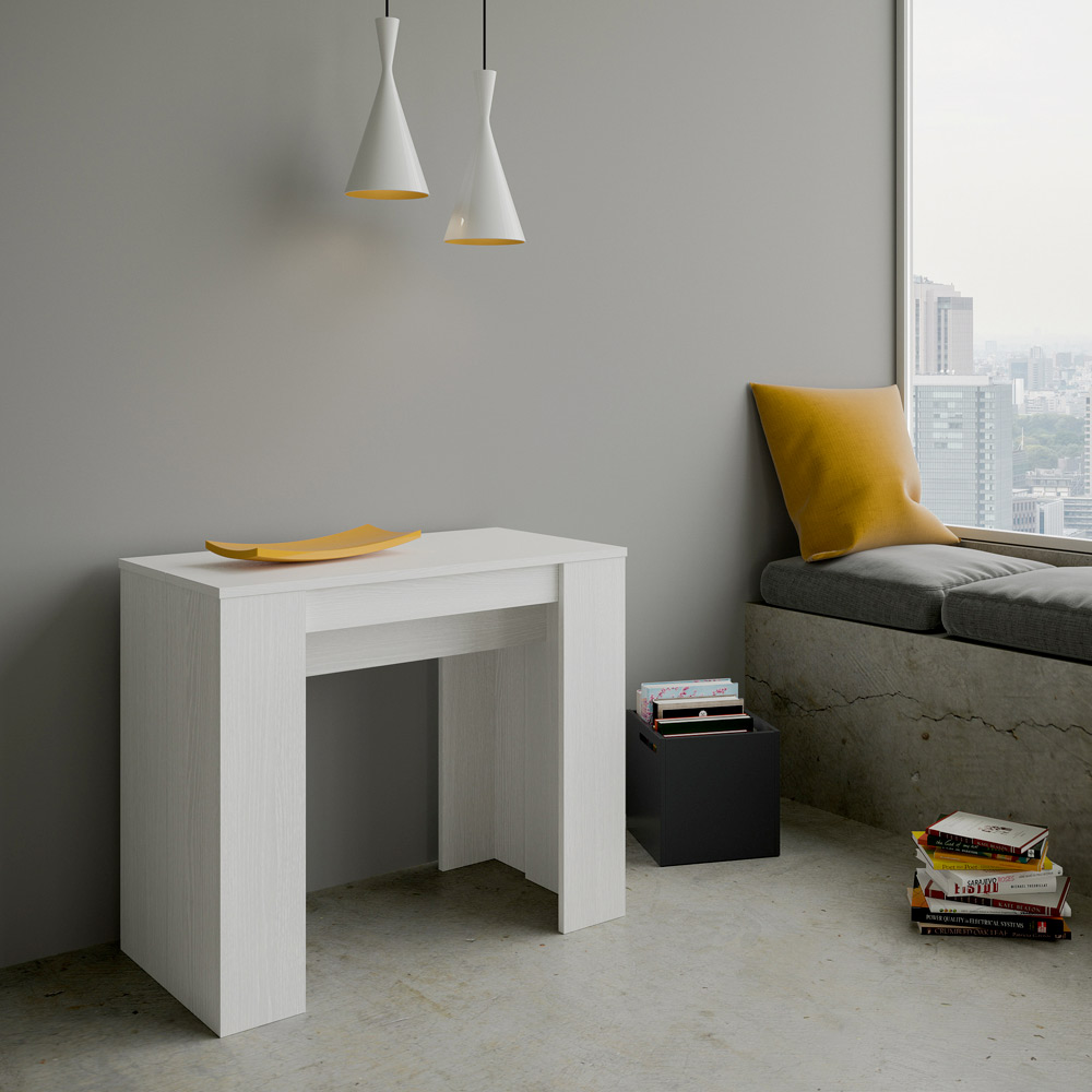 Esta mesa de consola extensível é uma obra-prima de design contemporâneo e funcionalidade intuitiva. A madeira mobiliada, o tampo e os lados oferecem uma sensação brilhante e aberta, ideal para quem procura criar um espaço que seja ao mesmo tempo aerado e moderno. A sua estética essencial e limpa torna-o adequado para qualquer ambiente, perfeito para se encaixar num design minimalista ou como contraste num design mais colorido e vivo.