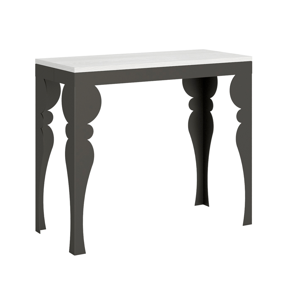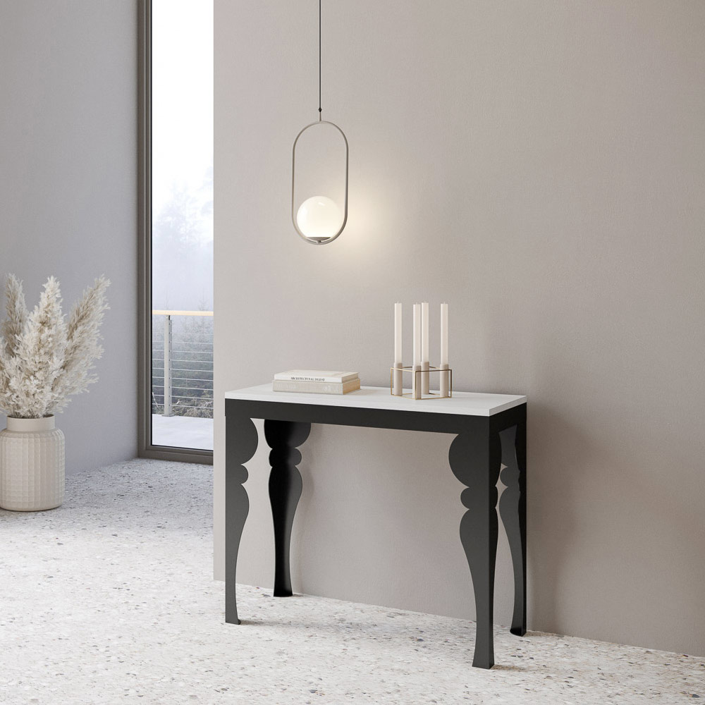Esta mesa de consola extensível representa uma fusão sublime de elegância e engenho. Com suas pernas esculpidas que trazem à mente a graça de eras passadas, a mesa de console se apresenta como um objeto de design que combina história e modernidade.