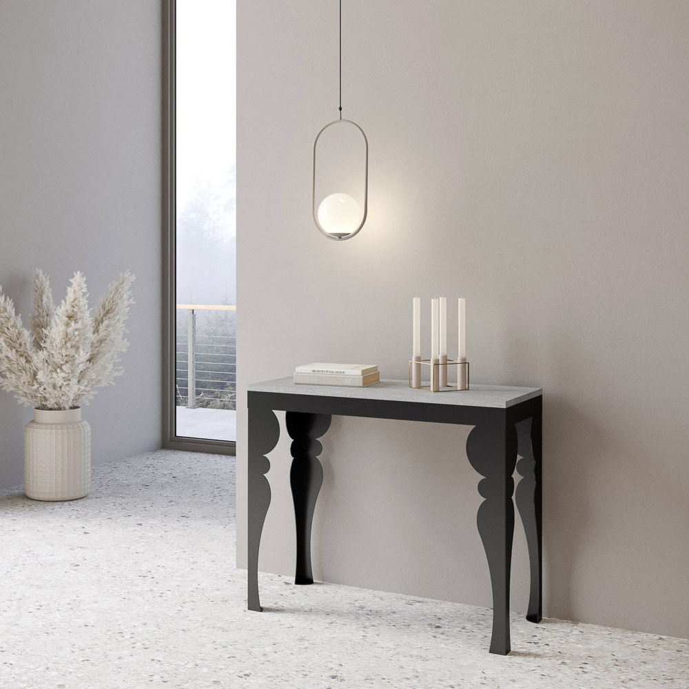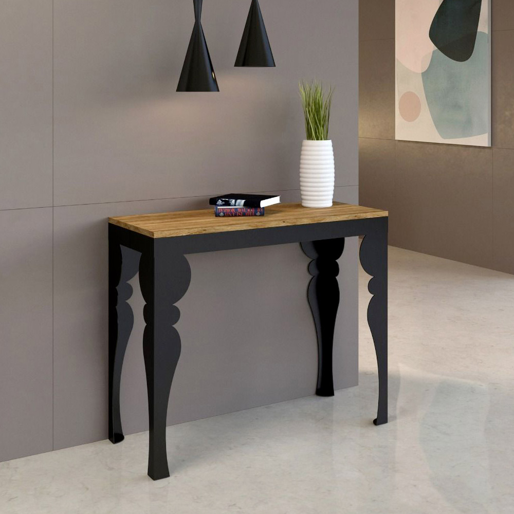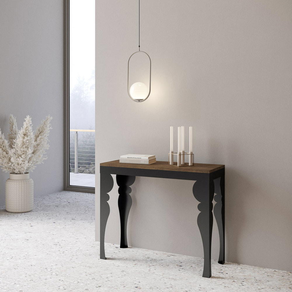 O contraste entre o cinzento antracite das pernas e a madeira do tampo cria um diálogo visualmente estimulante, tornando esta peça de mobiliário uma escolha sofisticada para qualquer divisão. Perfeita como móvel de entrada ou como uma superfície adicional numa sala de estar, a mesa de consola transforma-se com facilidade, estendendo-se para se tornar a peça central de uma sala de jantar, pronta para acolher momentos memoráveis.