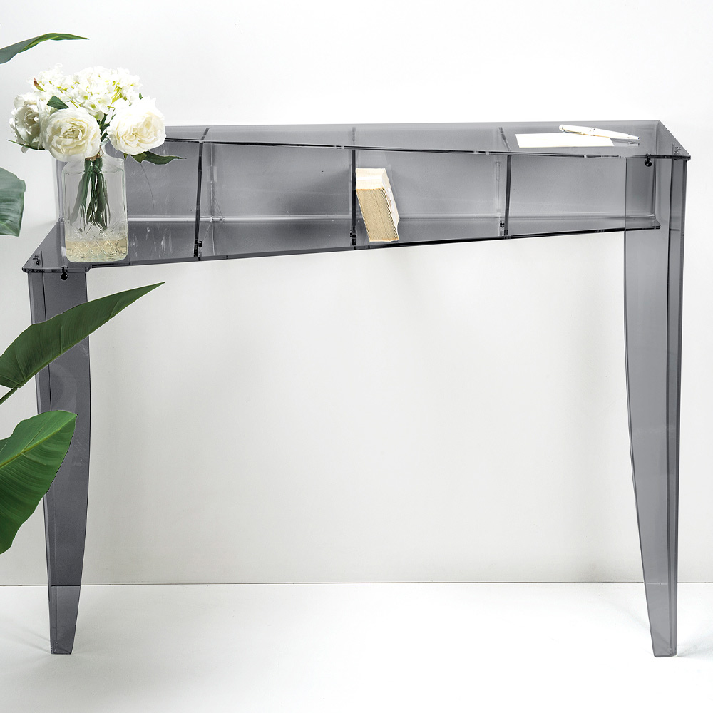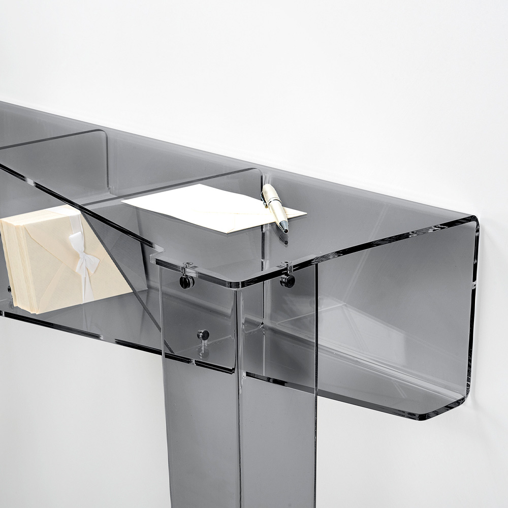 Com a sua estética discreta mas inesquecível, a consola é suficientemente versátil para ser notada sem sobrecarregar os restantes elementos do mobiliário. Sua superfície lisa e transparente é ideal para exibir arte, molduras de fotos ou simplesmente manter organizadas suas chaves e correspondência diária.