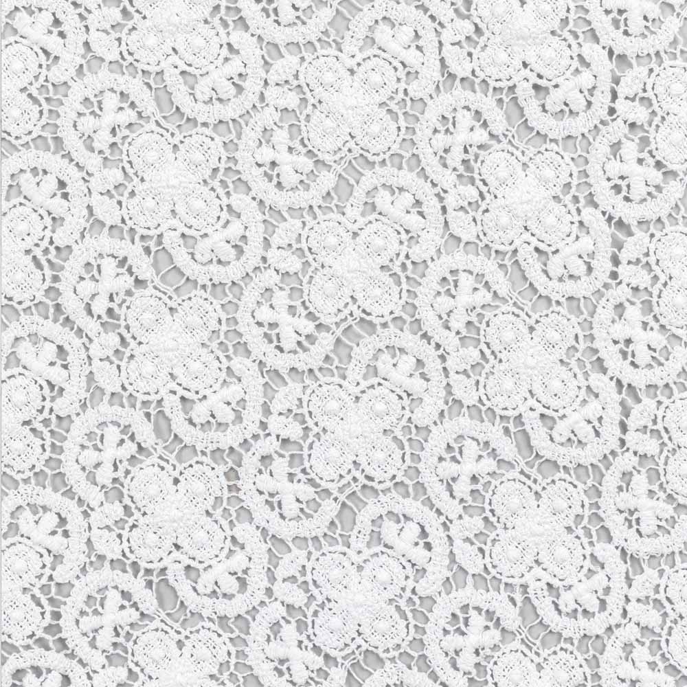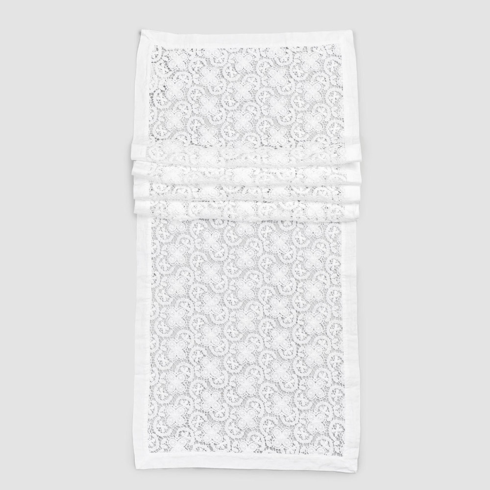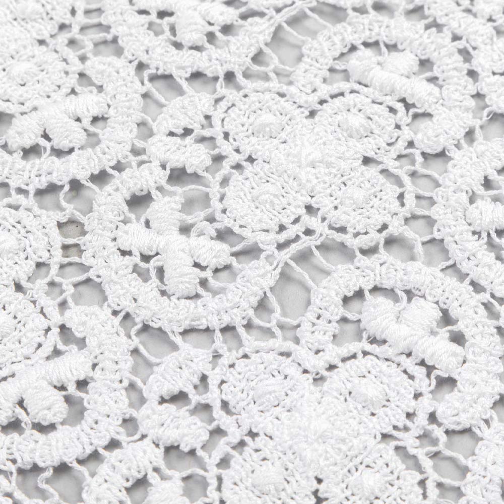 O corredor de decoração branca é inteiramente bordado em renda de crochê e apresenta uma borda de mistura de linho e algodão com vinco.