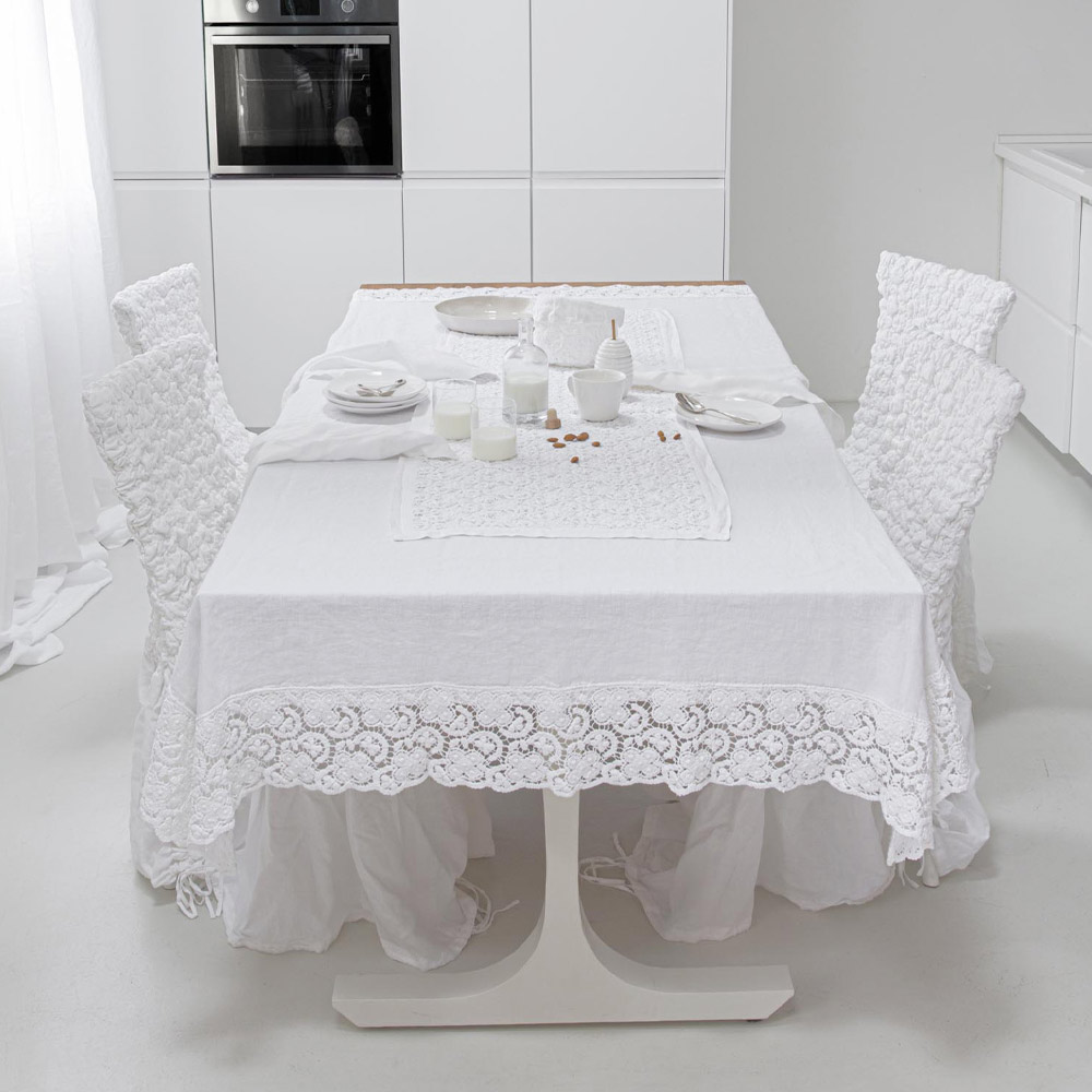 Corredor de mesa em renda de crochê com borda em linho e mistura de algodão, design luxuoso made in Italy.