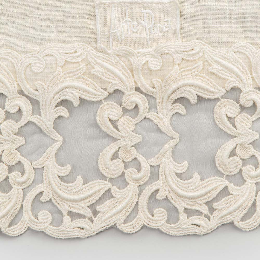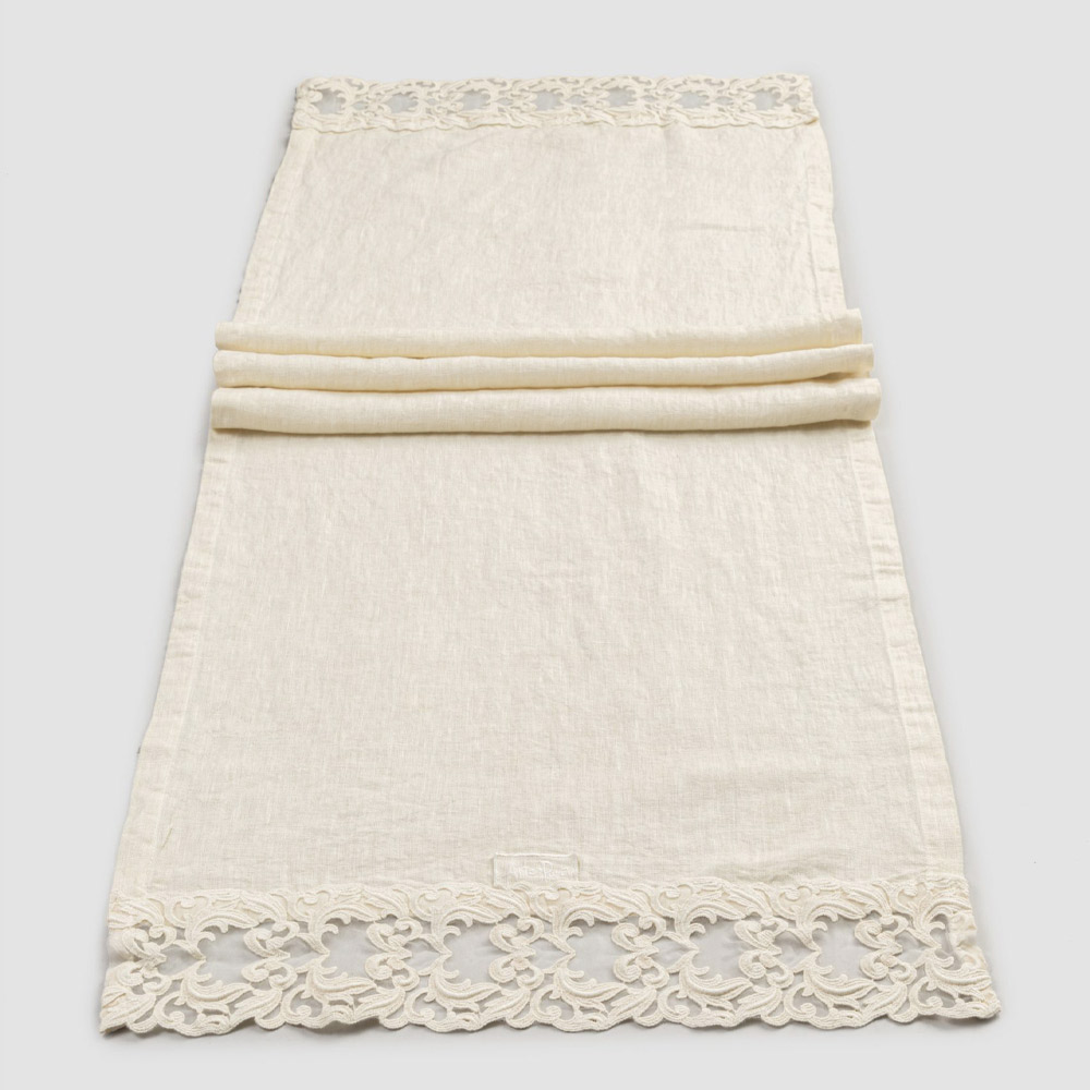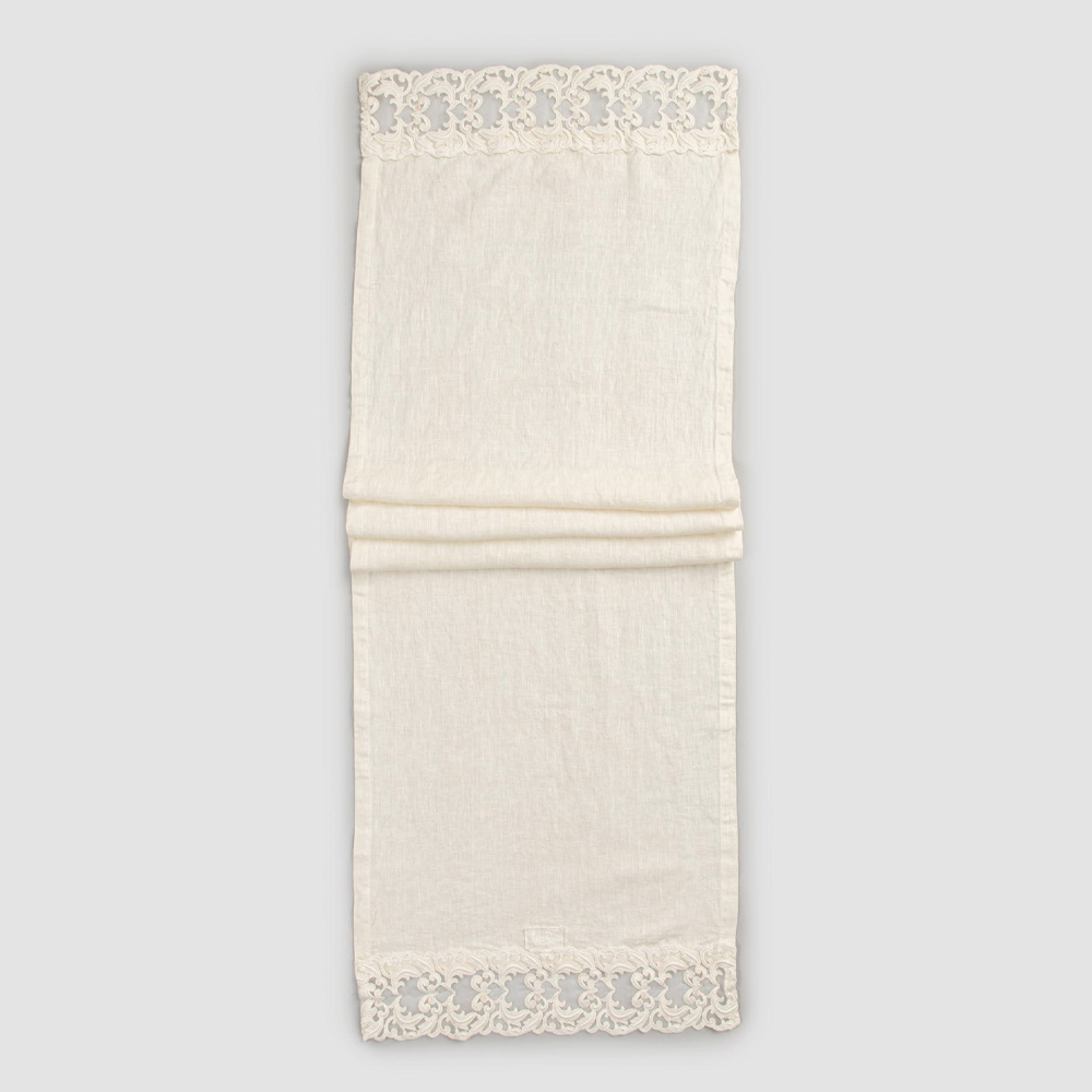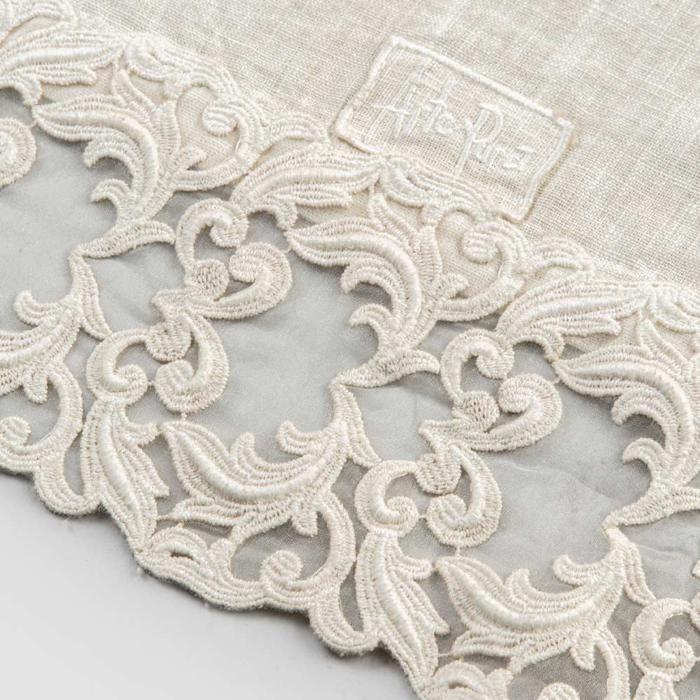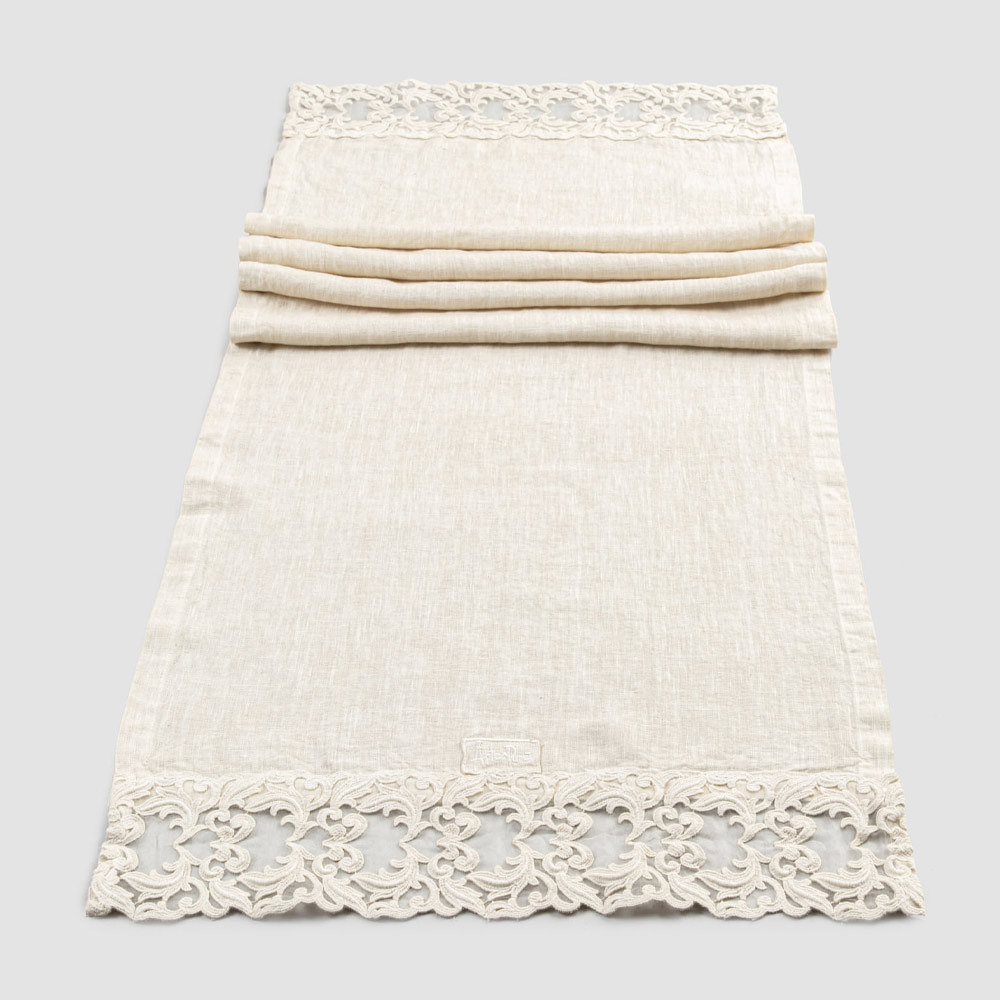 Corrediça de mesa de linho pesado com renda e rebordo dobrado, luxo made in Italy.