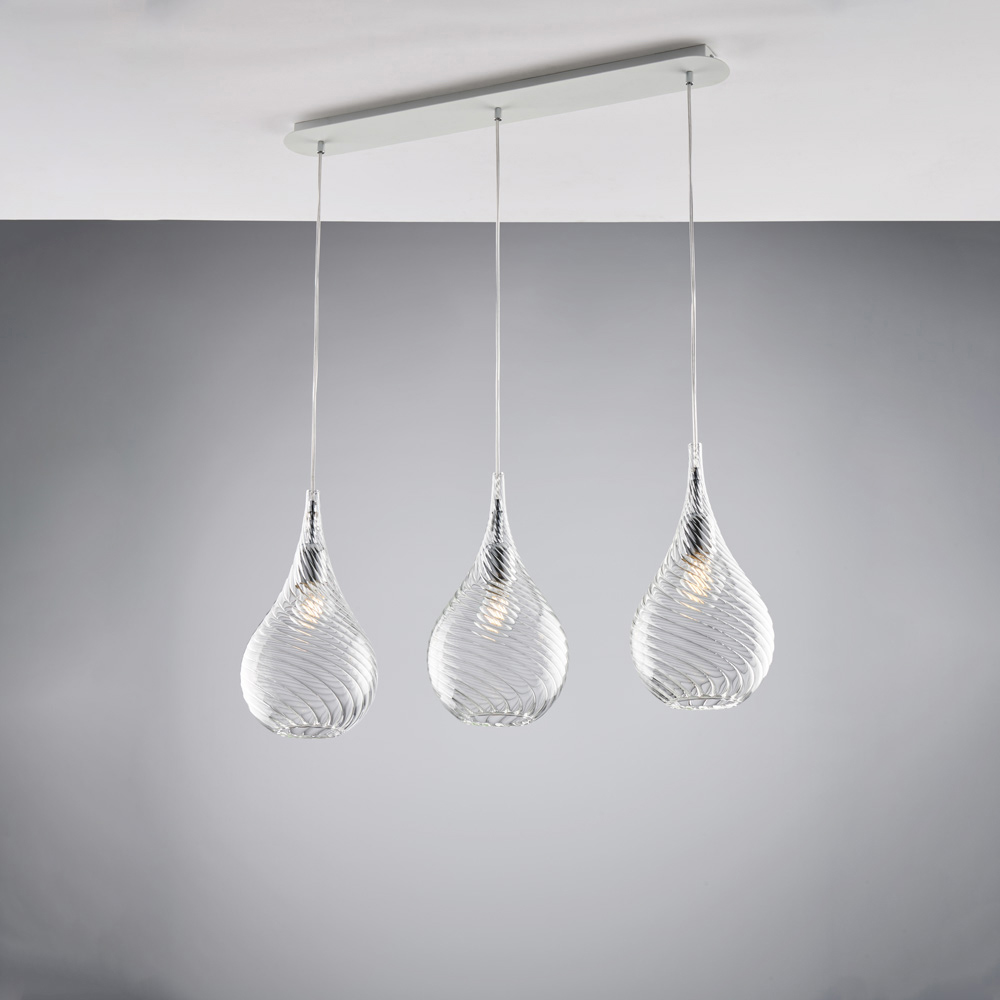 Elegante e funcional, este pendente artesanal em trilho de ferro com vidro Pyrex é uma solução de iluminação contemporânea, projetada para valorizar os espaços com equilíbrio e leveza. Os três difusores de vidro Pyrex sinuosos e refinados são suspensos em um trilho linear que garante uma distribuição uniforme da luz e um forte impacto estético.