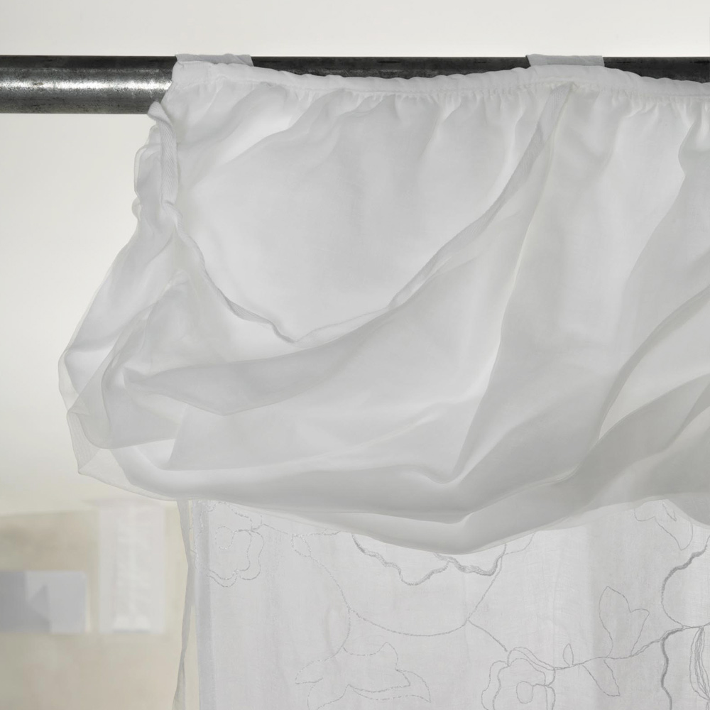 cortina branca em gaze de linho e organza com rosas bordadas e tecido enrolado em conjunto com argolas para haste.