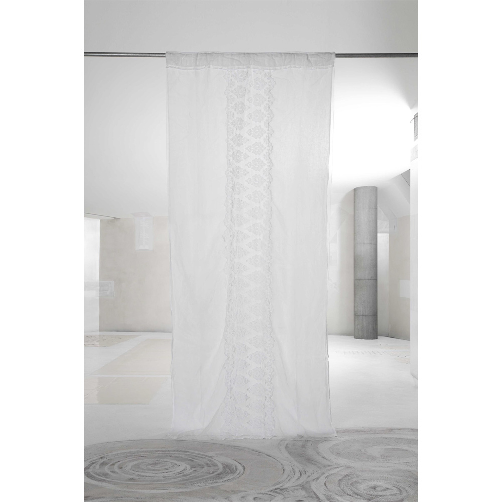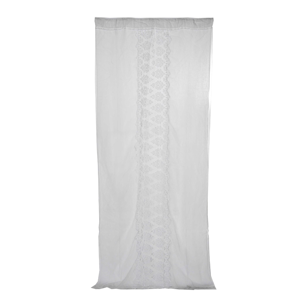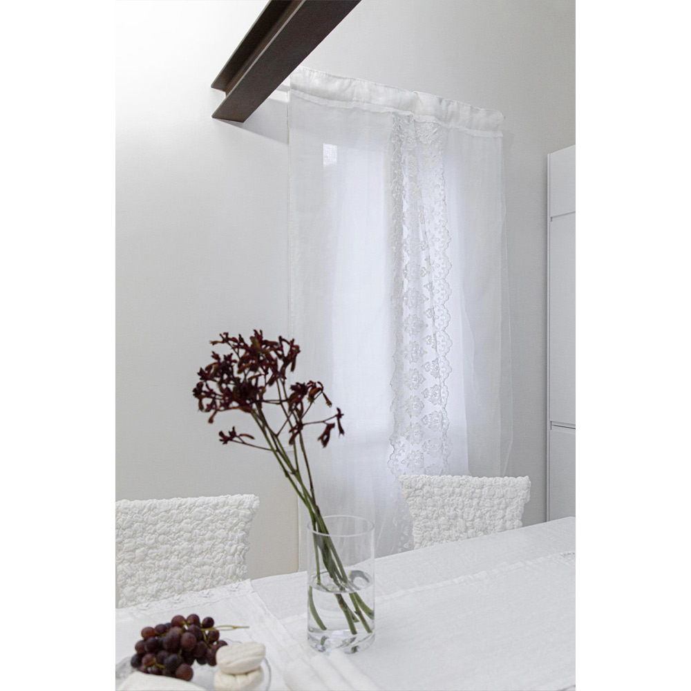 O valor da tradição alia-se ao estilo de vida moderno com esta cortina de linho branco claro natural com organza e bordado gótico vertical na parte central e predisposição para cana na parte superior com decoração em organza.