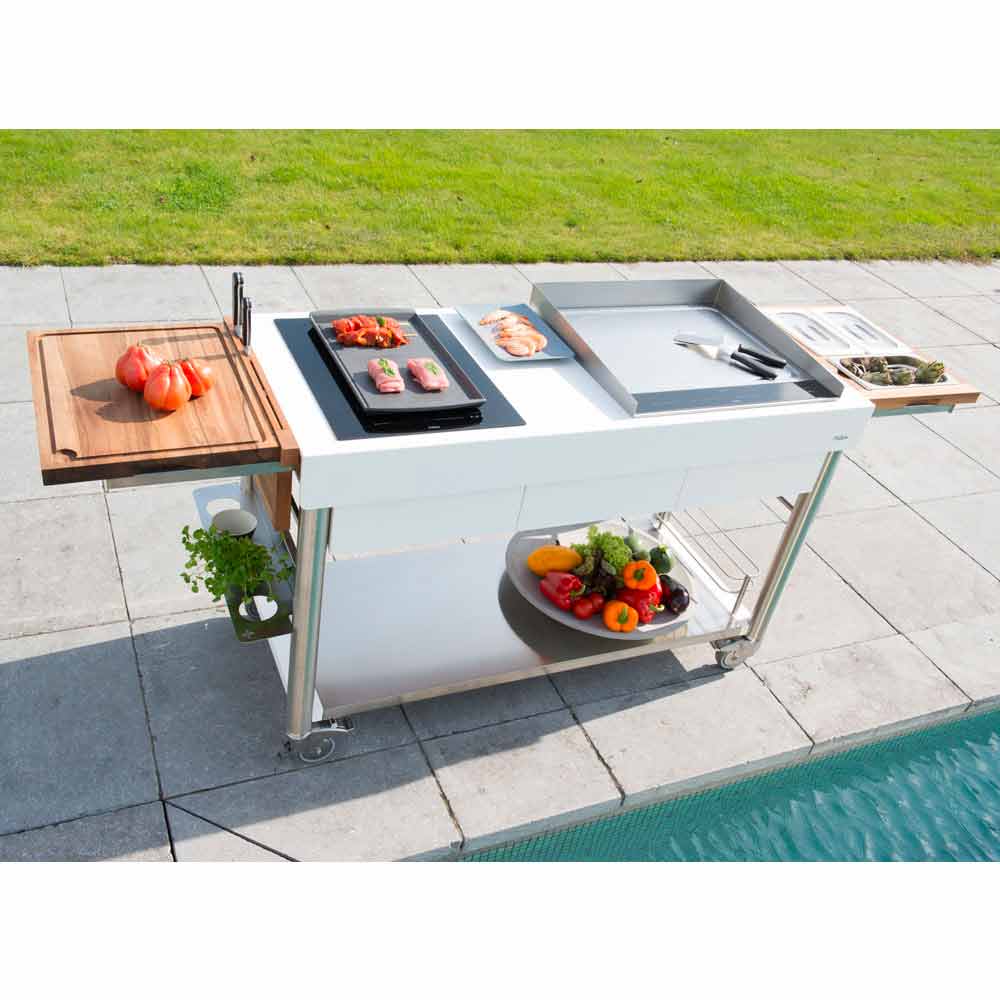 É uma cozinha ao ar livre sobre rodas, caracterizada por uma estrutura robusta que utiliza aço inoxidável escovado , acabamentos e tampo em compósito de alta qualidade com acabamento em madeira maciça. Noz, você pode colocar onde preferir: no jardim, no terraço ou na piscina, por um efeito luxuoso e moderno.