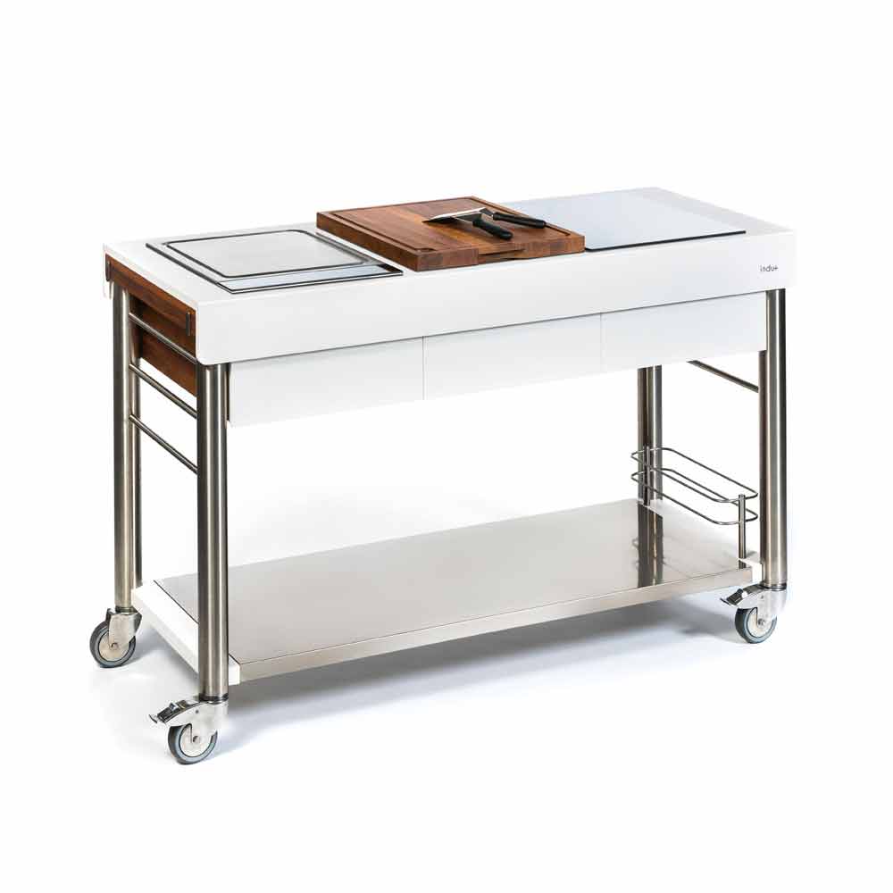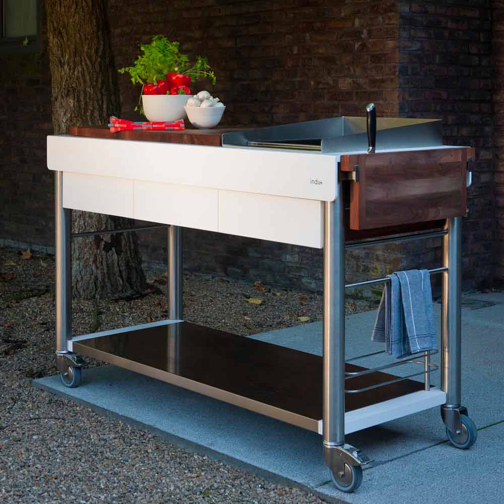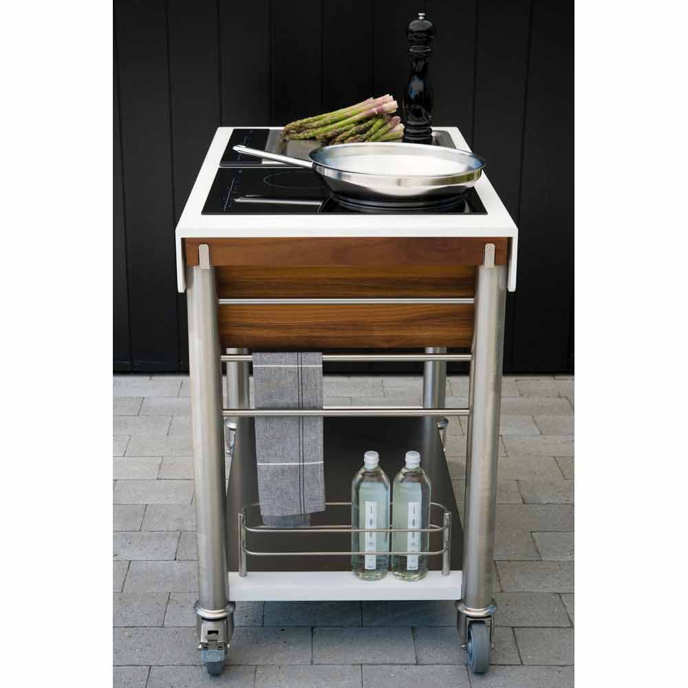 Cozinha externa sobre rodas em aço inoxidável e madeira de teca com placas intercambiáveis, dois tamanhos disponíveis, design moderno e alta qualidade.