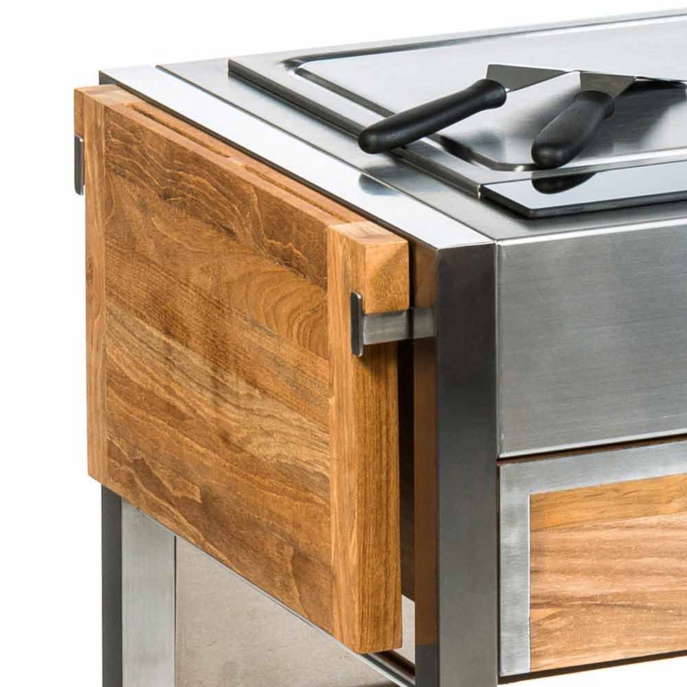 Cozinha ao ar livre moderna em madeira teca maciça e aço inoxidável sobre rodas, com placa de teppanyaki exclusiva.
