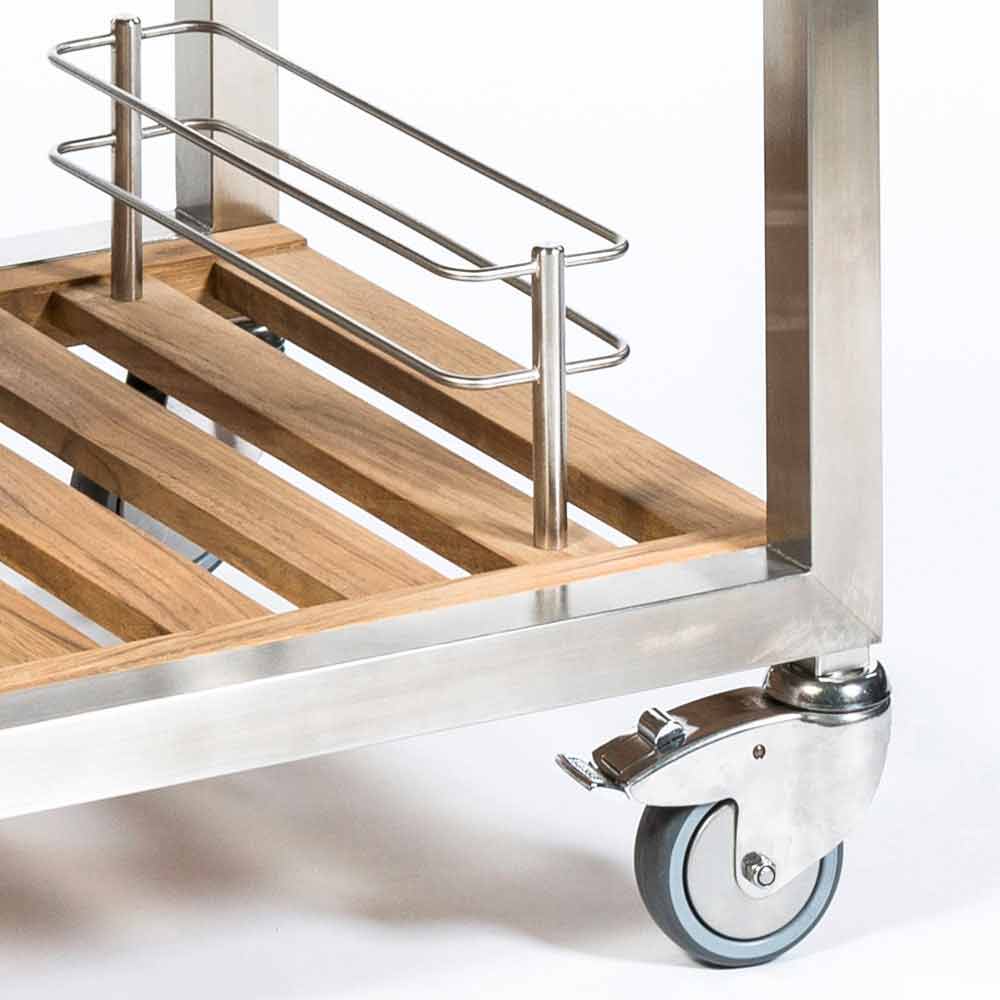 rodas de aço inoxidável resistentes com rolamentos de esferas e freio, para facilitar o transporte do carrinho por qualquer superfície.