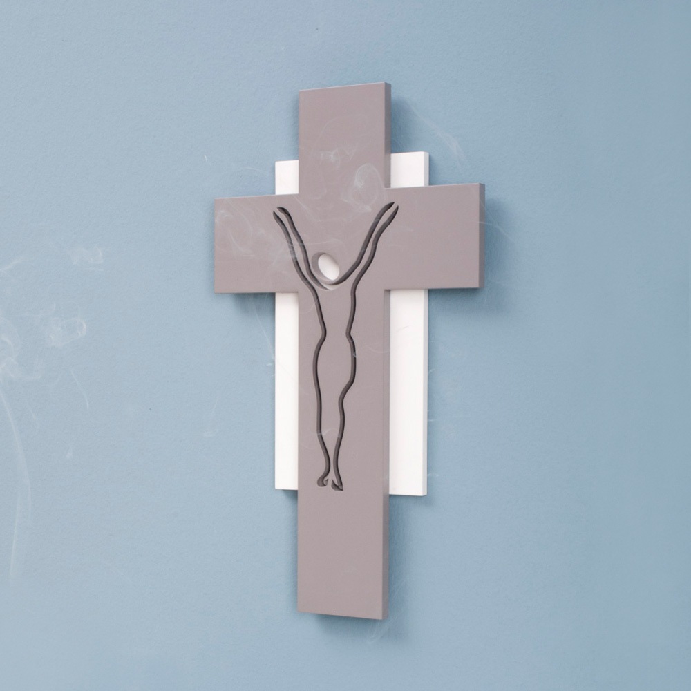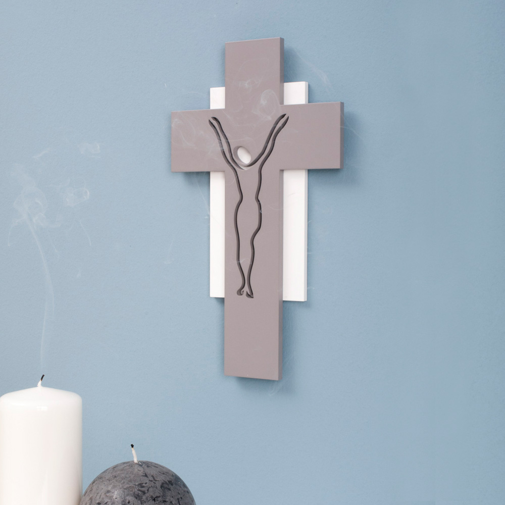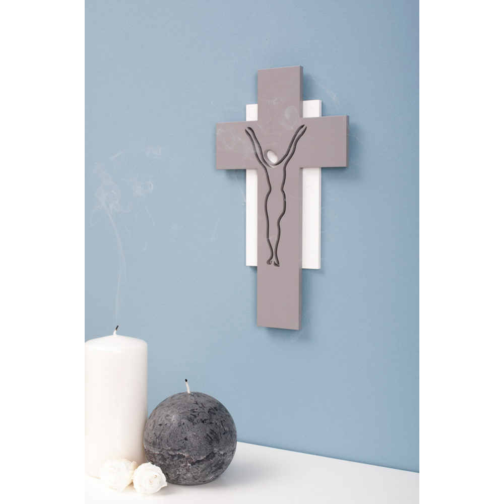 Crucifixo em madeira lacada a cinza com silhueta de Cristo Crucificado recortada a laser em contraste com rectângulo em madeira lacada a branco .