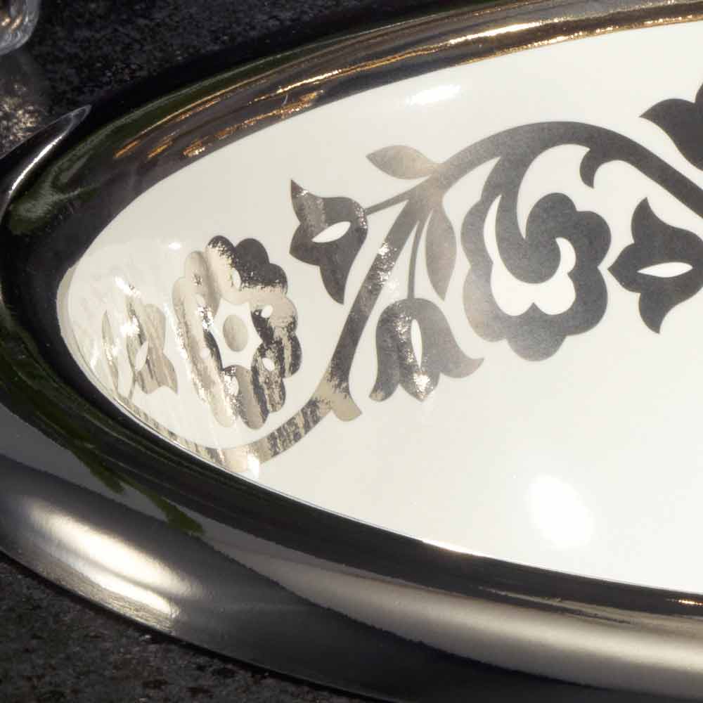 Casa de banho pia embutida feita na Itália em argila de fogo, feito à mão, decorado com tarja com flores de platina e ouro, pintados à mão em platina.