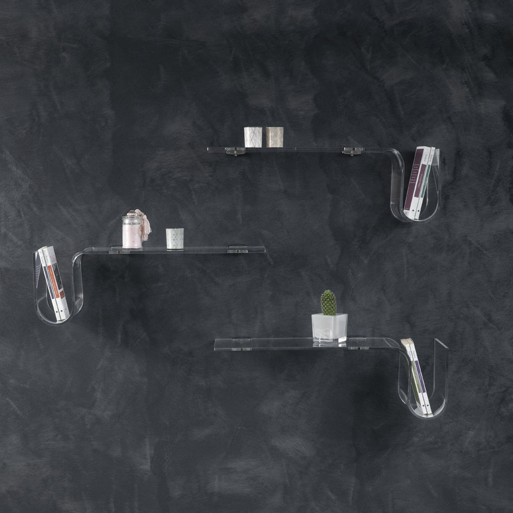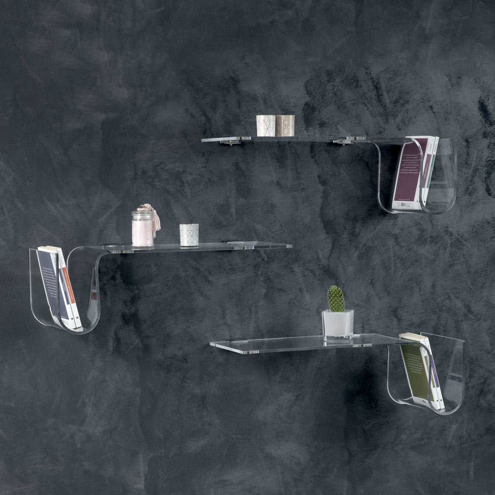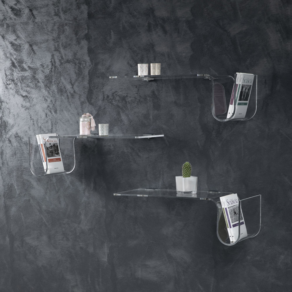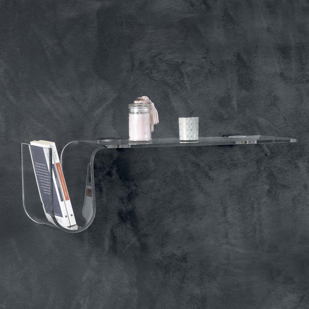 Esta prateleira de parede é feita inteiramente de cristal acrílico transparente de 8 mm de espessura , disponível na versão direita ou esquerda.