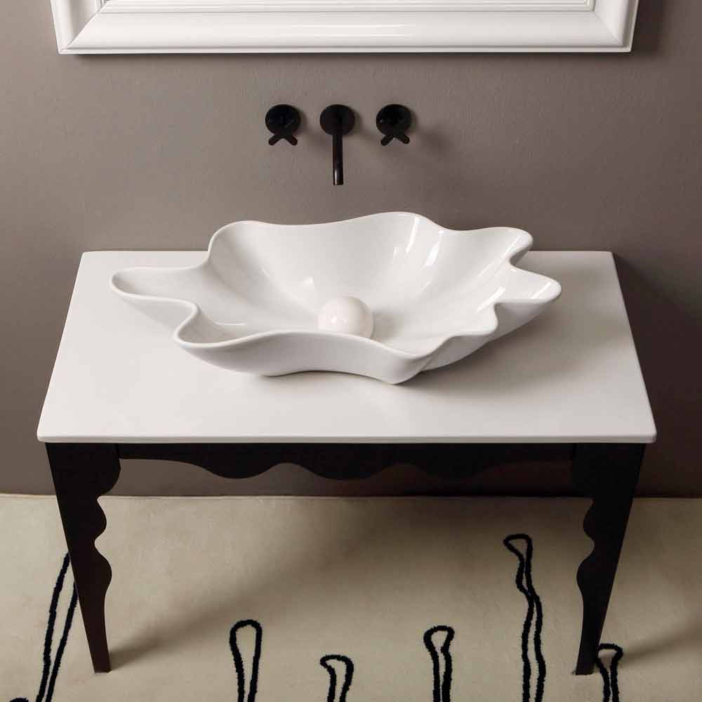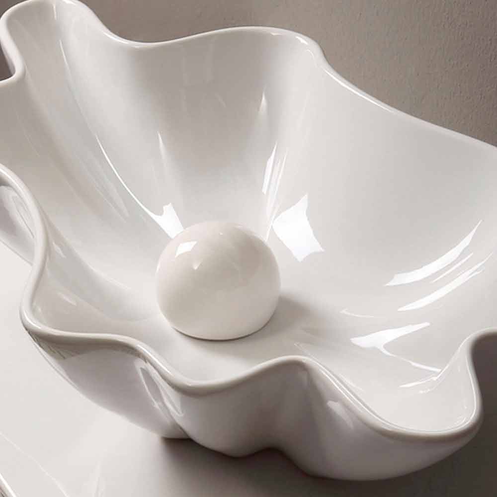 Lavatório que lembra o mar através de seu ralo perolado criando a ilusão de que se trata de uma ostra.